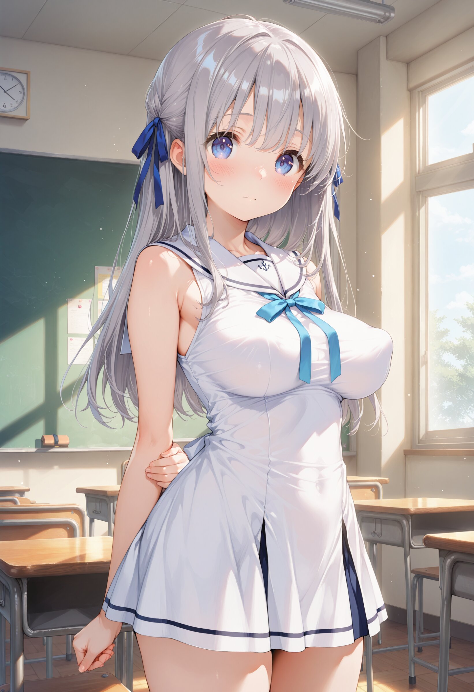 masterpiece, best quality, amazing quality, general, fine detail, official art, 1girl, loli, petite, silver hair, (white sailor dress:1.2), miniskirt, blue ribbon, sleeveless, big breasts, (perky breasts:1.2), innocent expression, classroom, cowboy shot,