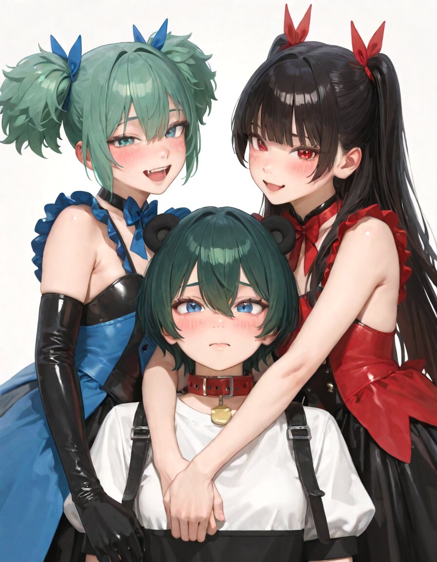3 girls hug each others., Yummy ,embarrassed , Idol outfit anime paint, ( flat:0.2), sharp lineart A highly detailed portrait of a young woman, ultra-sharp focus, 8k resolution, photorealistic, crisp edges, perfect lighting, intricate textures, DSLR quality, shallow depth of field,<COL> (short twintails hair:2.0), ( mint green hair , blue hair, two tone hair ) ( big hair , big twintails:1.4) , (( permed volume hair)) ,( bangs between eyebrows:1.2 ), (( round face )) , (blue bow tie) , ( black elbow long raced opera gloves:1.4), ,sleepy ,( holy cross corker) , view any ware , ( holy cross shaped hair ornament ) , drunk , laugh , , goth l<COL> ( Cute vtuber with ( mint green:1.4) short hair) , extra short hair, Cobalt blue eyes , kinky bangs, kinky to out side hair near both ears, meshy hair, bangs between eyes, small hair, handsome cut hair, Her short hair should be styled in kinky, flipped bangs, [flipped hair:0.8], view any where, panda hat, ( red collar) <COL> black straight twintail hair girl red eyes