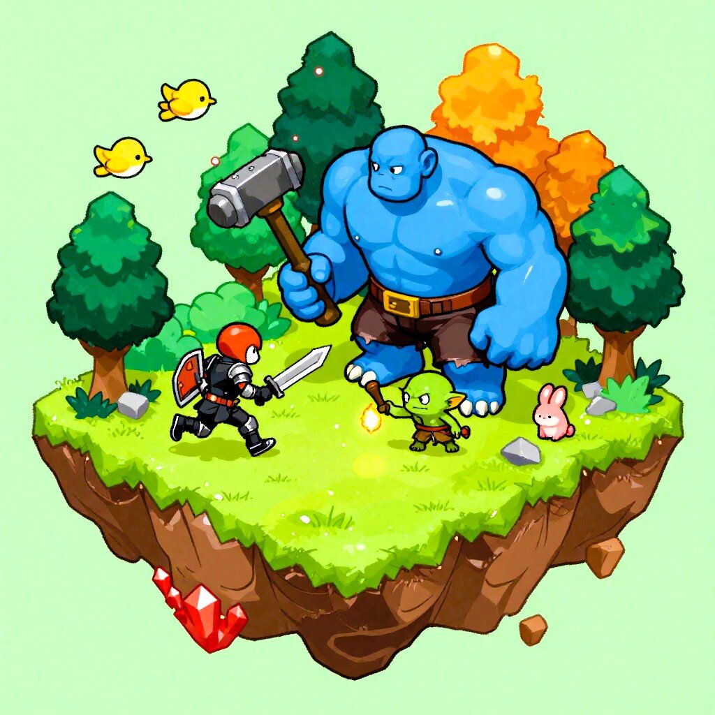 Subject: A vibrant isometric diorama in a chibi kawaii art style inspired by the video RPG. The scene is presented as a floating slice of terrain on a light green background. Characters: - Giant: A large human monster, blue skin, massive muscle, he hold a battle hammer. he look at the Hunter. - The Hunter: A warrior wearing leater armor gear on the left side. They are sprinting away, ready to the sword and shield. - Goblin: A small green human monster with ponted ear, has a wooden club and wearing rag, at front of giant, target to the Hunter. - Endemic Life: • Two round yellow birds flying in the upper left. • A small pink rabbit standing near the right grassy area. Environment: - A lush forest-like floating island with green grass, rounded bushes, and stylized trees with dark green and orange foliage. - A fallen log and various rock formations add texture. - A cluster of red crystals protrudes from the bottom-left edge of the floating island. Style: - Isometric art style with clean, bold outlines and warm, saturated colors. - Exaggerated proportions for cuteness, giving a playful contrast to the normally dangerous monsters. - Clear shapes, simplified forms, and a whimsical, retro-fantasy mood. Technical: - Strong isometric perspective emphasizing depth and layered composition. - Crisp linework, flat shading, and vibrant color separation. - Detailed rendering of character expressions, fireball effects, and screen-friendly chibi proportions.
