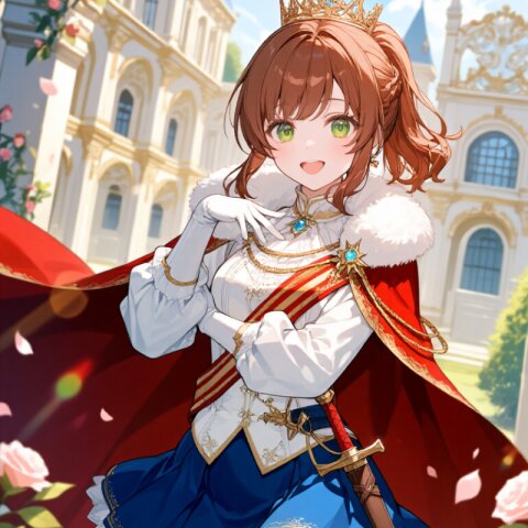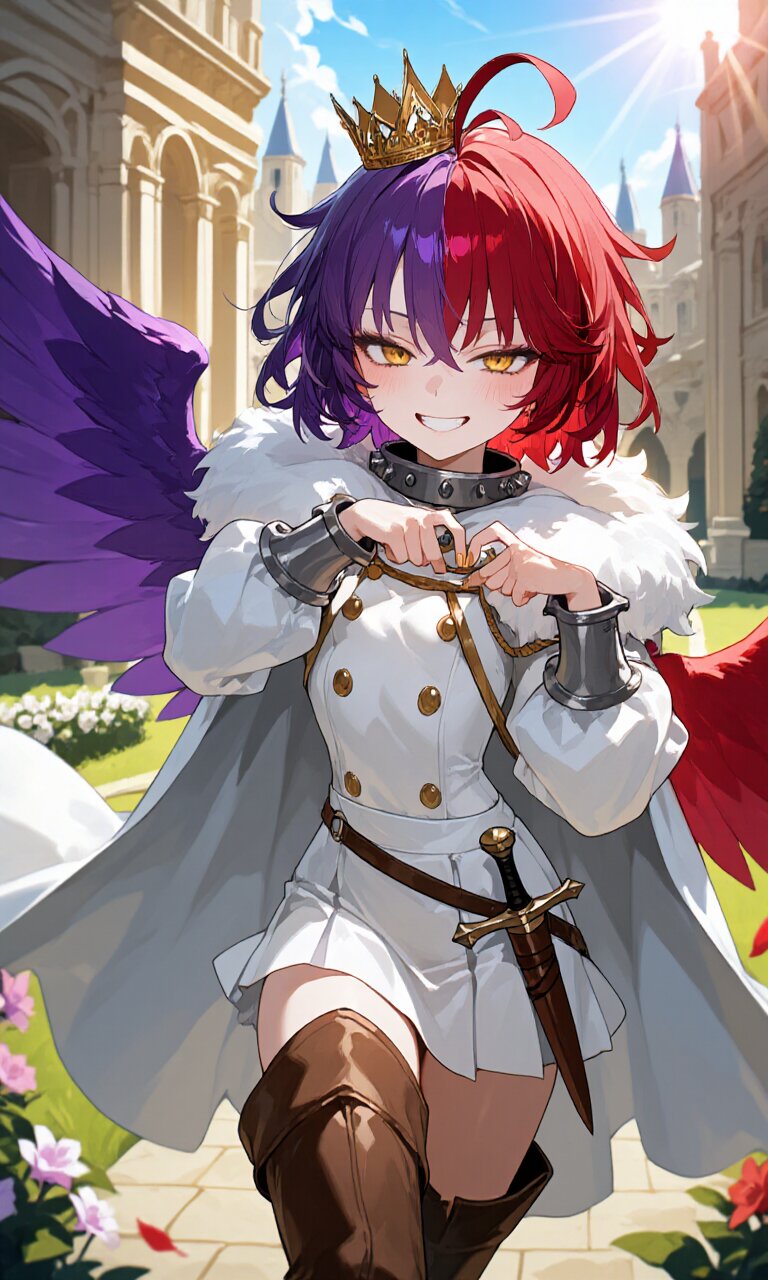 A 17-year-old girl with (symmetry colored hair:1.5) - half vibrant purple and half deep red - styled in short, messy layers with choppy bangs framing her delicate face. Her slanted yellow eyes sparkle with mischief as she grins cheerfully, embodying a Prince Charming persona. Despite her (low height:1.2) and skinny frame with narrow waist and (petite hip:1.2), she carries an air of royal confidence. She wears a (White luxurious Prince costume:1.6) with long sleeves, paired with a (luxurious White mini skirt:1.4) and (Brown luxurious long boots:1.3). A (luxurious White Cape:1.3) flows dramatically behind her, while a (luxurious crown on head:1.4) and steel collar complete her regal yet rebellious look. A (Dagger on waist:1.3) hints at her warrior spirit. Her asymmetrical purple and red wings spread elegantly as she strikes a cute pose in the palace gardens. The Romanesque architecture surrounds her, with flowers blooming under the afternoon sun. Sunbeams filter through the blue sky, creating lens flares that highlight her beautiful hair and detailed costume. The scene radiates romantic academia vibes with insanely detailed textures in her clothes, skin, and hair.