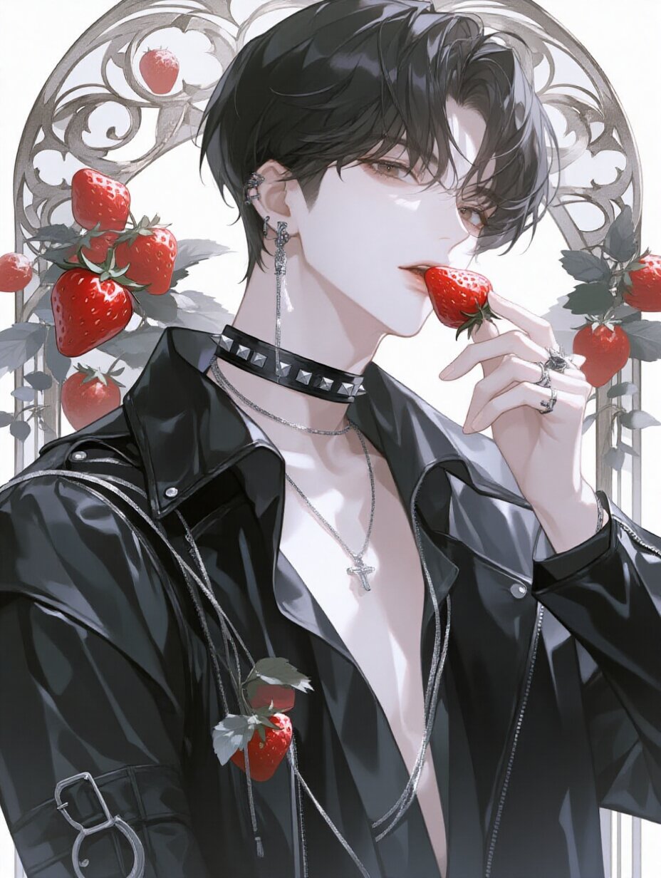 The central figure is a young man with Asian features, in his early twenties. He holds a strawberry in his left hand, bringing it close to his lips. A delicate and elegant young man, breathtakingly beautiful, with short, soft black hair parted slightly to the side, clear brown eyes, pale skin, and a calm, thoughtful expression. He wears a black leather jacket, a studded choker around his neck, and a delicate necklace. Various rings adorn his fingers, and a bracelet is visible on his wrist. He wears a slightly provocative expression. The background features an Art Nouveau-style arch motif with strawberries, and several strawberries are depicted. Light falls from the upper left, creating highlights on his face and skin for a dramatic effect. The illustration has a sophisticated atmosphere, giving an overall cool and stylish impression.