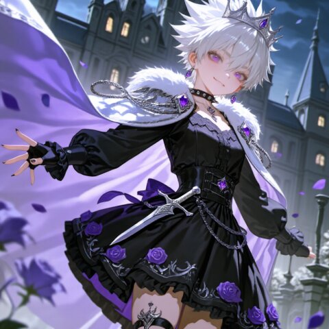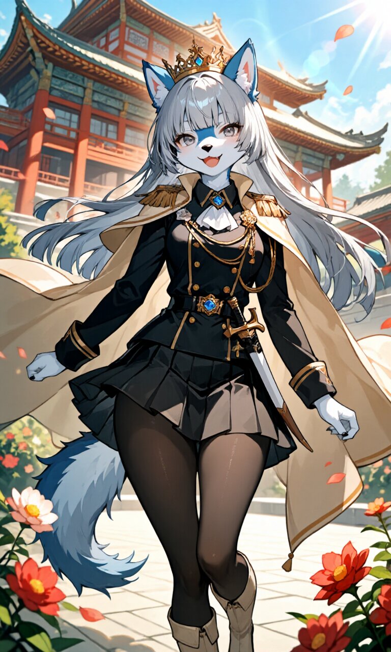 **artist: , ,** A wolf girl with striking blue fur stands proudly in afternoon sunlight, her fluffy ears perked up attentively and bushy tail swaying gently. Her slender frame boasts a narrow waist contrasting with wide hips and thick thighs, while her silver hime-cut hair cascades over delicate facial features - long bangs partially obscuring gleaming silver eyes. She wears an exquisite black Prince costume with long sleeves, paired with a beige cape that billows elegantly in the breeze and a luxurious black mini skirt that sways with her movement. The outfit is completed with black pantyhose, beige leather boots, a jeweled dagger at her waist, and an ornate crown resting atop her head. Behind her stretches an ornate Taiwanese palace with intricate architectural details, surrounded by vibrant local flowers in full bloom. Golden sunlight filters through the blue sky, creating soft lens flares that highlight her joyful expression as she smiles warmly at the viewer. The scene captures a perfect balance between romantic academia aesthetics and natural beauty, with every strand of fur, fold of fabric, and petal rendered in hyper-detailed 16k resolution. Her pose exudes cheerful confidence, embodying both princely charm and playful femininity against this culturally rich backdrop.