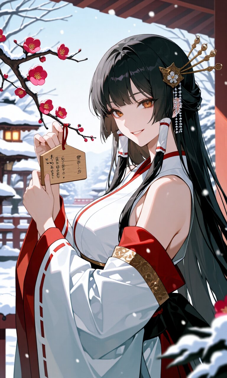 Sleeveless shrine maiden robe, long black hair, brown eyes, water-twisted hair ornaments, holding an ema votive tablet, offering a bewitching smile as she prepares to hang the tablet on a plum branch—a New Year's scene, snowy landscape.