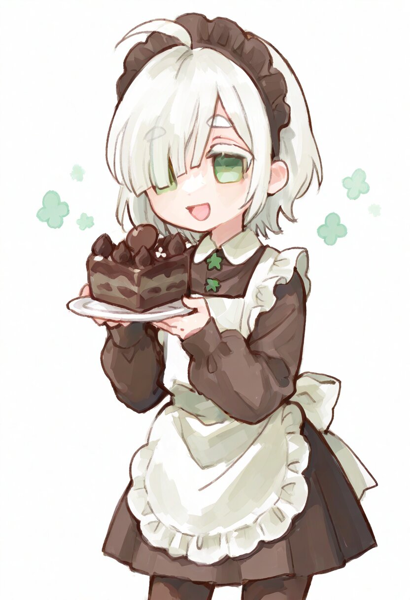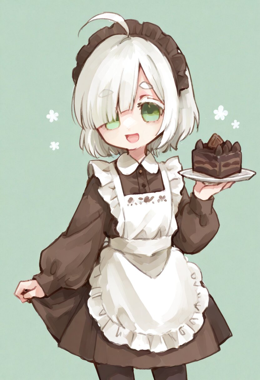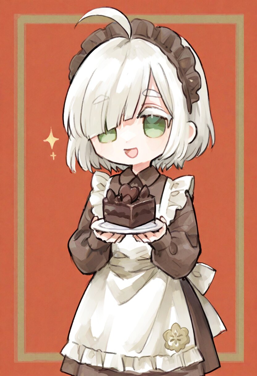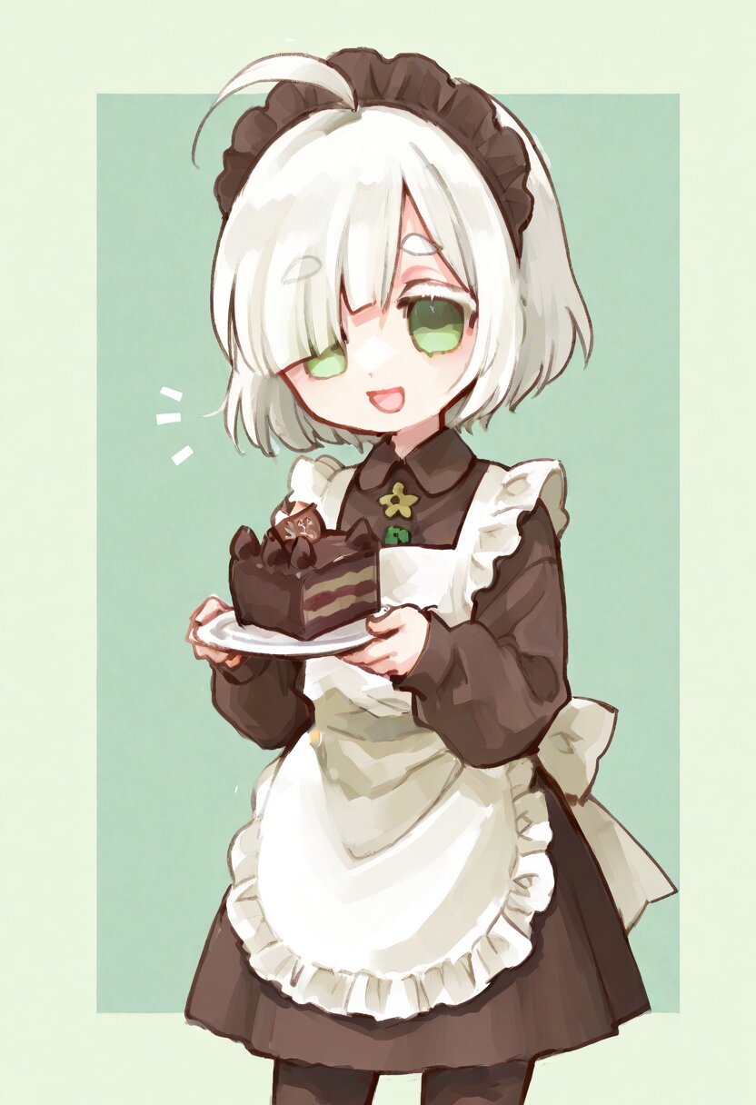 <lora:inmnstyleilxl:0.9>, ultra-detailed, best quality, masterpiece, very aesthetic, watercolor painting, general, chibi, solo, 1girl, hold a chocolate cake on plate, brown dress, detailed golden embroidery, long sleeves, puffy sleeves, white apron, brown maid head dress, brown tights, cowboy shot, smile, open mouth, (bright white hair), short hair, blunt bangs, white thick eyebrow, white colored eyelashes, (hair over one eye), ahoge, mint green eyes, sleeves past wrists
