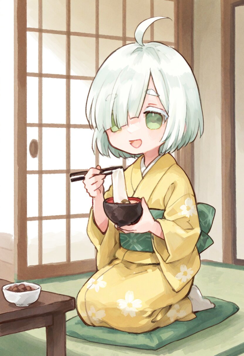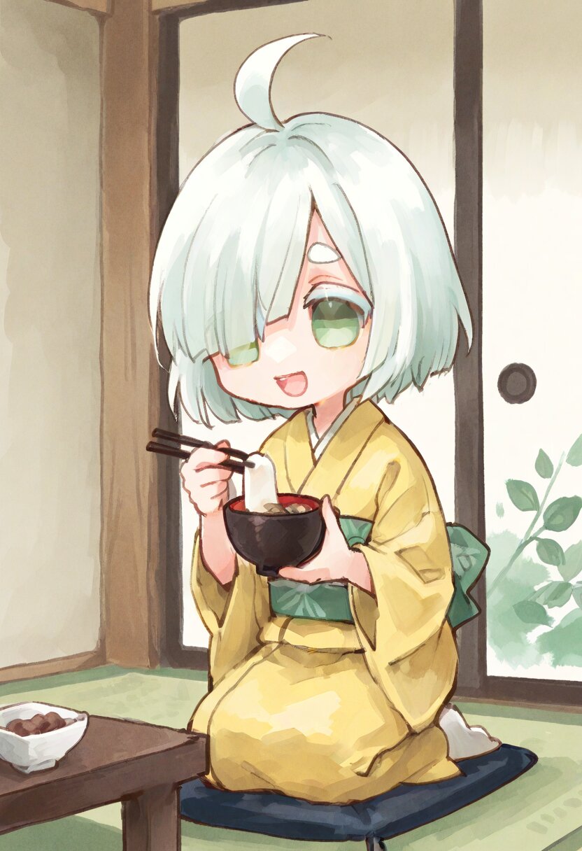 <lora:inmnstyleilxl:0.9>, ultra-detailed, best quality, masterpiece, very aesthetic, watercolor painting, general, chibi, solo, 1girl, Japanese room, low table, mochi and red beans in bowl, holding bowl, holding chopstick, (bright white hair), short hair, blunt bangs, white thick eyebrow, white colored eyelashes, (hair over one eye), ahoge, mint green eyes, yellow kimono, seiza, smile, open mouth