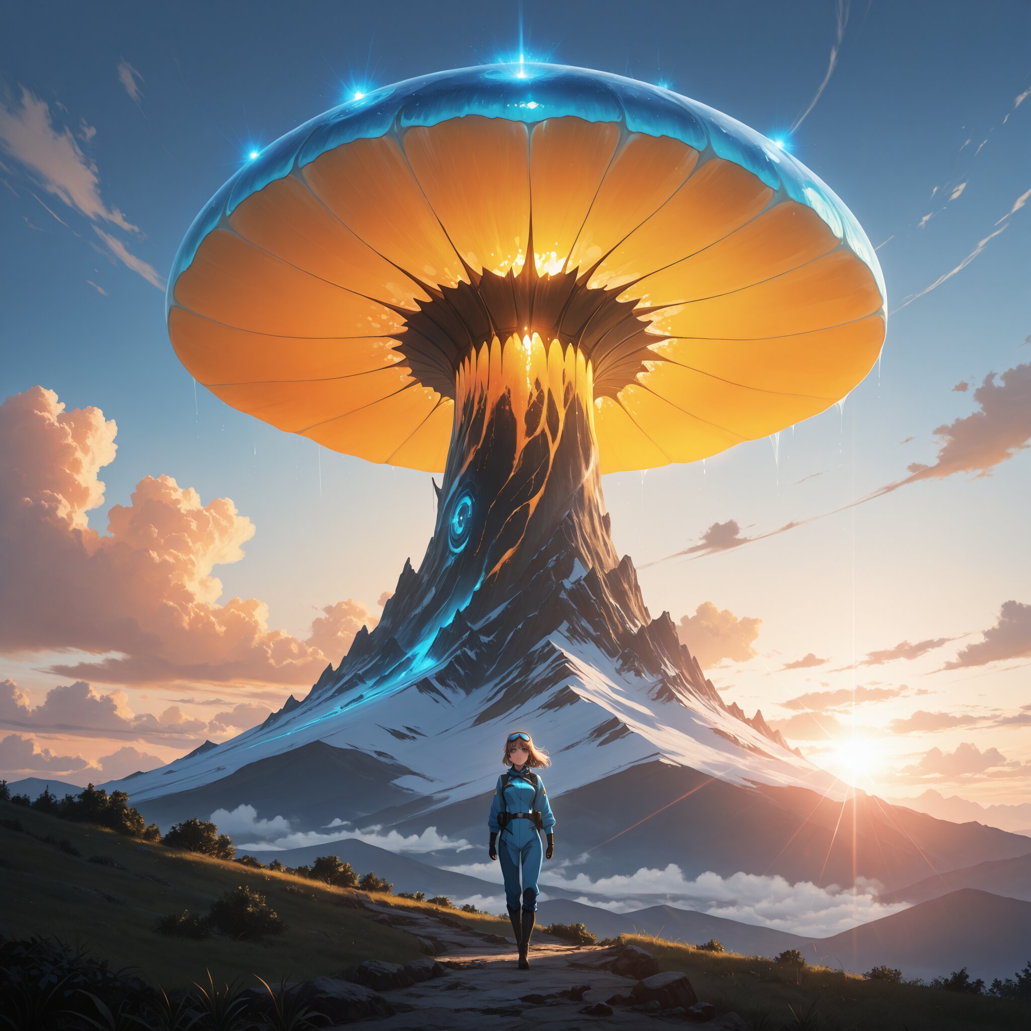 masterpiece, best quality, photorealistic, sharp focus, cinematic lighting, depth of field, beautiful composition, vibrant colors, ultra high res, 8K, highly detailed, masterpiece, best quality, very detailed, (masterpiece:1.2), (best quality), (ultra-detailed), 1girl, solo, wearing aviator goggles and blue explorer outfit, flying on a white organic glider (Mehve style), soaring through the sky, panoramic view of a toxic jungle below, giant glowing fungi, turquoise spores floating in the air, golden hour sunlight, dramatic clouds, wind in hair, cinematic lighting, Studio Ghibli art style influence, highly detailed landscape, epic scale.