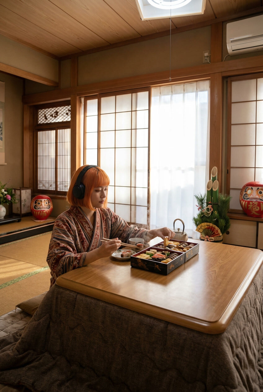 Wide composition, cinematic, ultra-detailed, serene Japanese New Year atmosphere. A traditional Japanese living room during the New Year holidays. The room is warmly lit by soft winter sunlight filtering through shoji screens, creating gentle shadows across tatami mats and wooden beams. A low kotatsu sits at the center of the room, covered with a thick, textured futon patterned with subtle traditional motifs. Steam rises faintly in the cool air, suggesting warmth and comfort. On top of the kotatsu is an exquisitely arranged osechi ryori spread: layered jubako boxes lacquered in deep red and black, filled with beautifully detailed dishes — glossy kuromame, golden kazunoko, vibrant datemaki, shrimp with curved crimson shells, carefully arranged vegetables carved into floral shapes. Small porcelain plates, chopsticks on rests, and a simple teapot complete the setting. Zena sits at the kotatsu, appearing relatively small within the overall composition, blending naturally into the calm domestic scenery. She has orange bob hair and wears her signature headphones. Her outfit is a relaxed New Year style inspired by her idol look: a soft, warm kimono-style top with subtle shoulder slits and a short skirt adapted for sitting comfortably at the kotatsu. Her legs are tucked beneath the futon, posture casual and natural. Zena is in the middle of eating osechi, holding chopsticks delicately as she reaches for a dish, captured in a quiet, everyday moment.