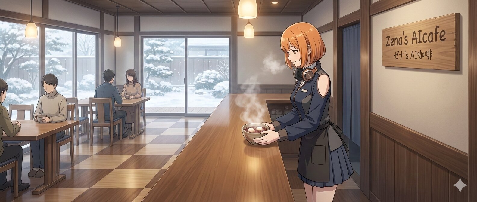 Full body, wide composition, cinematic, ultra-detailed, serene and warm atmosphere. A Japanese-modern café known as Zena’s AIcafe, incorporating refined elements of Japanese culture. The floor features a clean ichimatsu-pattern design, with modern wooden table seating; no tatami is used. The space is calm, uncluttered, and softly illuminated by gentle winter light. At the café counter stands Zena, carefully serving a bowl of oshiruko (traditional Japanese sweet red bean soup). Steam rises softly from the bowl, conveying warmth against the cool winter air. The oshiruko is presented simply and beautifully, with plump mochi floating gently, emphasizing comfort and seasonal care rather than extravagance. Zena has short orange bob-cut hair, her signature headphones resting naturally around her neck. She wears a Japanese-modern café staff uniform that harmonizes with the space — refined, modest, and practical, featuring subtle shoulder slits and a neatly balanced mini skirt appropriate for café work. Her expression is gentle and attentive, offering the oshiruko with both hands in a respectful gesture of hospitality. Her posture is calm and grounded, embodying omotenashi — quiet kindness without performance. The atmosphere is peaceful and nurturing: soft highlights, delicate steam, natural textures of wood and ceramics, and a transparent winter ambience. The focus is on warmth, care, and the simple joy of being welcomed in from the cold. Style: anime movie quality, soft natural winter lighting, minimal color palette, high clarity, realistic Japanese-modern café interior, emphasis on warmth and stillness. Tags: oshiruko, Japanese sweets, winter café, omotenashi, Japanese-modern interior, ichimatsu floor, no tatami, serene atmosphere, café counter, orange bob hair, headphones, shoulder slits, mini skirt, cinematic anime style