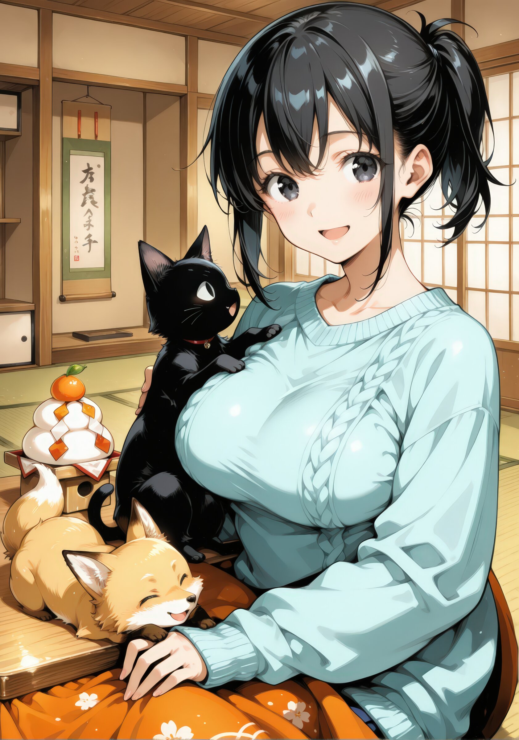 Best quality, Masterpieces, white background, negative space, anime-style illustration, fine detail, A girl staring intently at the kagami mochi, The kagami mochi sits atop the kotatsu., 1girl and 2animals, 1girl, (young girl), cute face and eyes, big breasts, black hair, clear black eyes, single short ponytail hair, cute and lovely, Vigorous, lively, and spontaneous personality, smile, open mouth, cute small fox cub, a black cat, (hazel theme:1.4), ((Pastel oversized sweater))