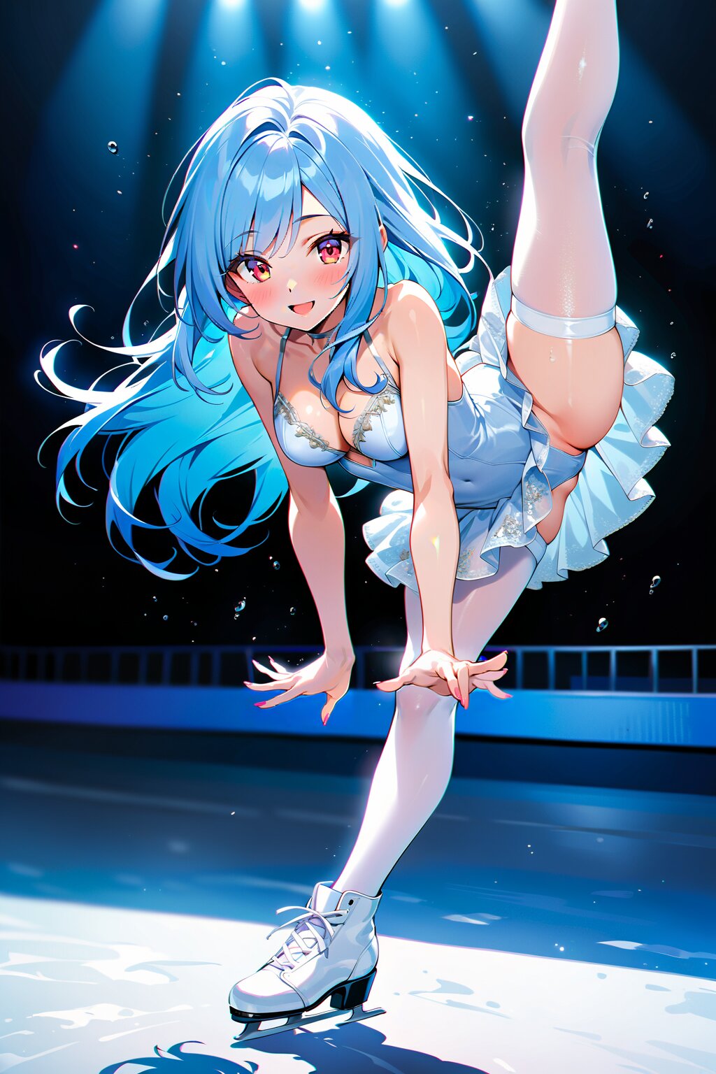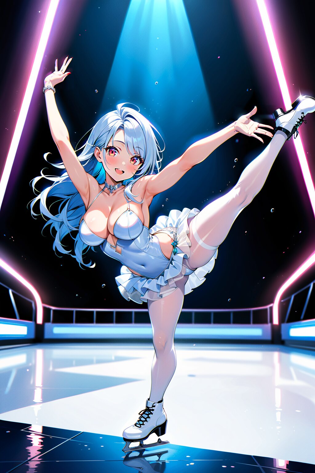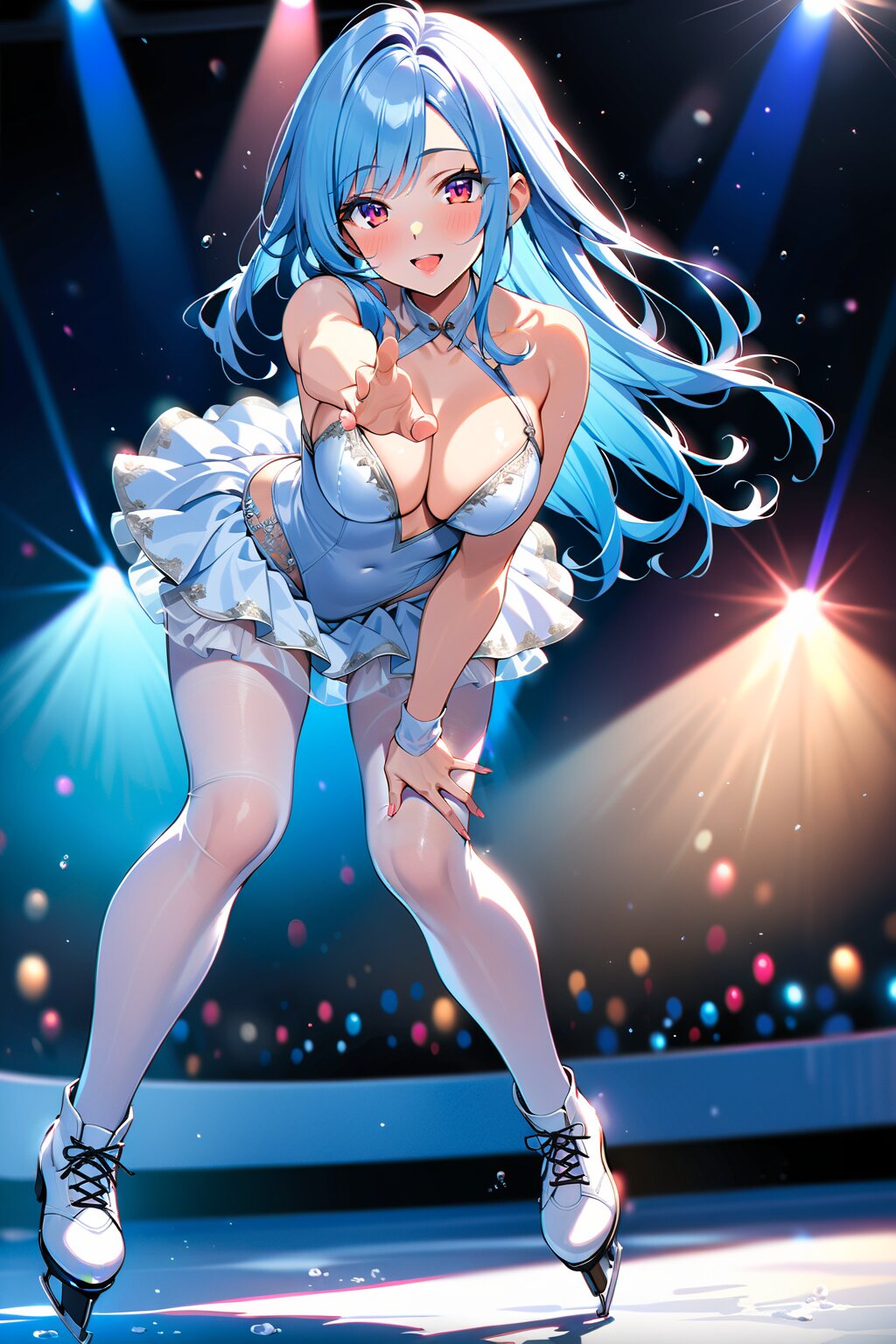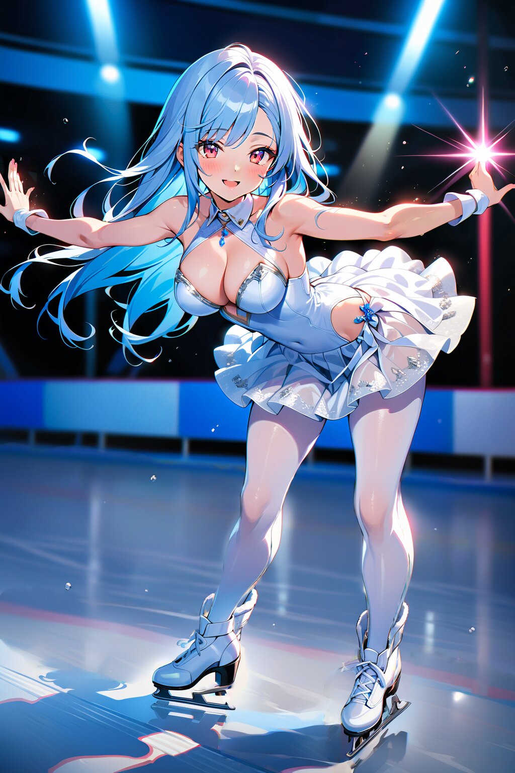 (full body:1.4), 1girl, solo, ice skating, (figure skating:1.2), (stretching arm:1.2), (bending arm:1.2), from front, (skating toward:1.3), (leaning forward;1.1), (stretching leg:1.3), (stretching fingers:1.2), looking at viewer, (motion blur:1.3), (light aqua long hair:1.4), (straight long hair:1.5), (asymmetrical bangs:1.3), (red eyes:1.2), japanese girl, (large breasts:1.4), (shiny skin, gleaming skin:1.4), (smile:1.3), open mouth, blush, BREAK (white theme:1.5), (all white:1.5), (fusion of white leotard and (white [[see-through]] tulle skirt, white [[see-through]] tutu):1.4), ((No sleeve, bare shoulders):1.3), (A leotard that tightly covers the torso:1.4), (insane high leg:1.3), (white pantyhose that covers from the waist to the toes without any gaps:1.3), (white skating shoes:1.2), (high quality material with elegant texture and luster:1.3), (beautiful and detailed silver embroidery:1.2), indoor, (skating rink:1.2), (on the ice:1.2), spot light, colorful light, blue theme, depth of field, wind, blurry back ground, ((8K, masterpiece ,best quality ,ultra-detailed)), game cg, masterpiece, (perfect face:1.1025), (perfect hands:1.1025), (perfect legs:1.1025), (perfect arms:1.1025), (perfect fingers:1.1025), <lora:xl_more_art-full_v1:0.6> <lora:add-detail-xl:1>