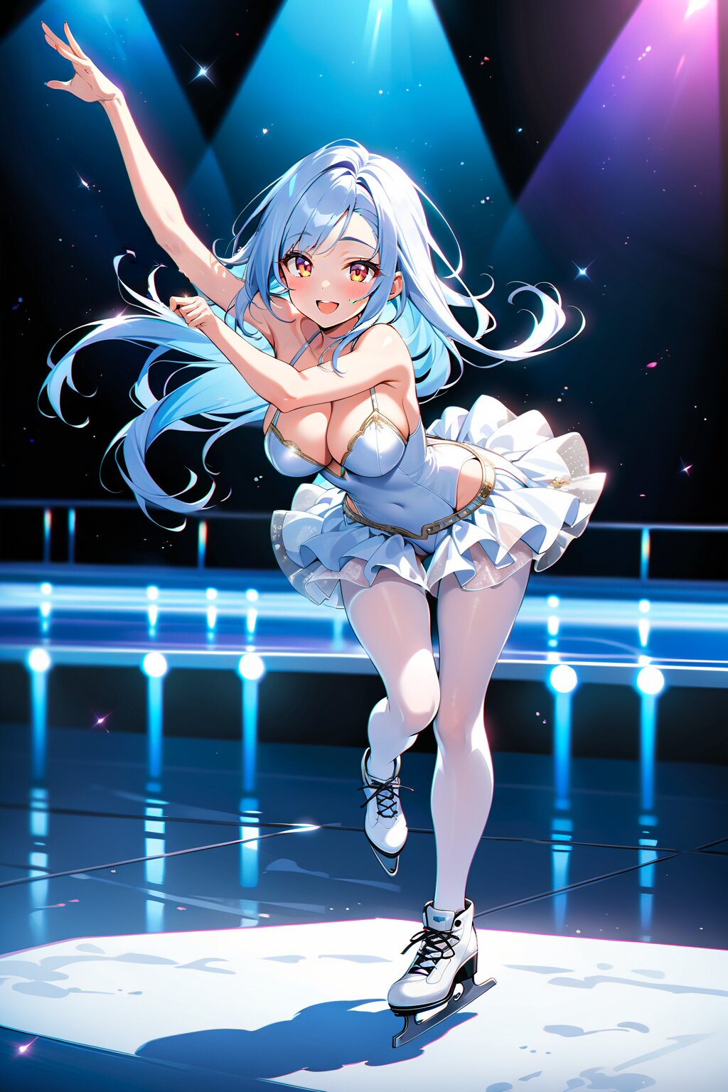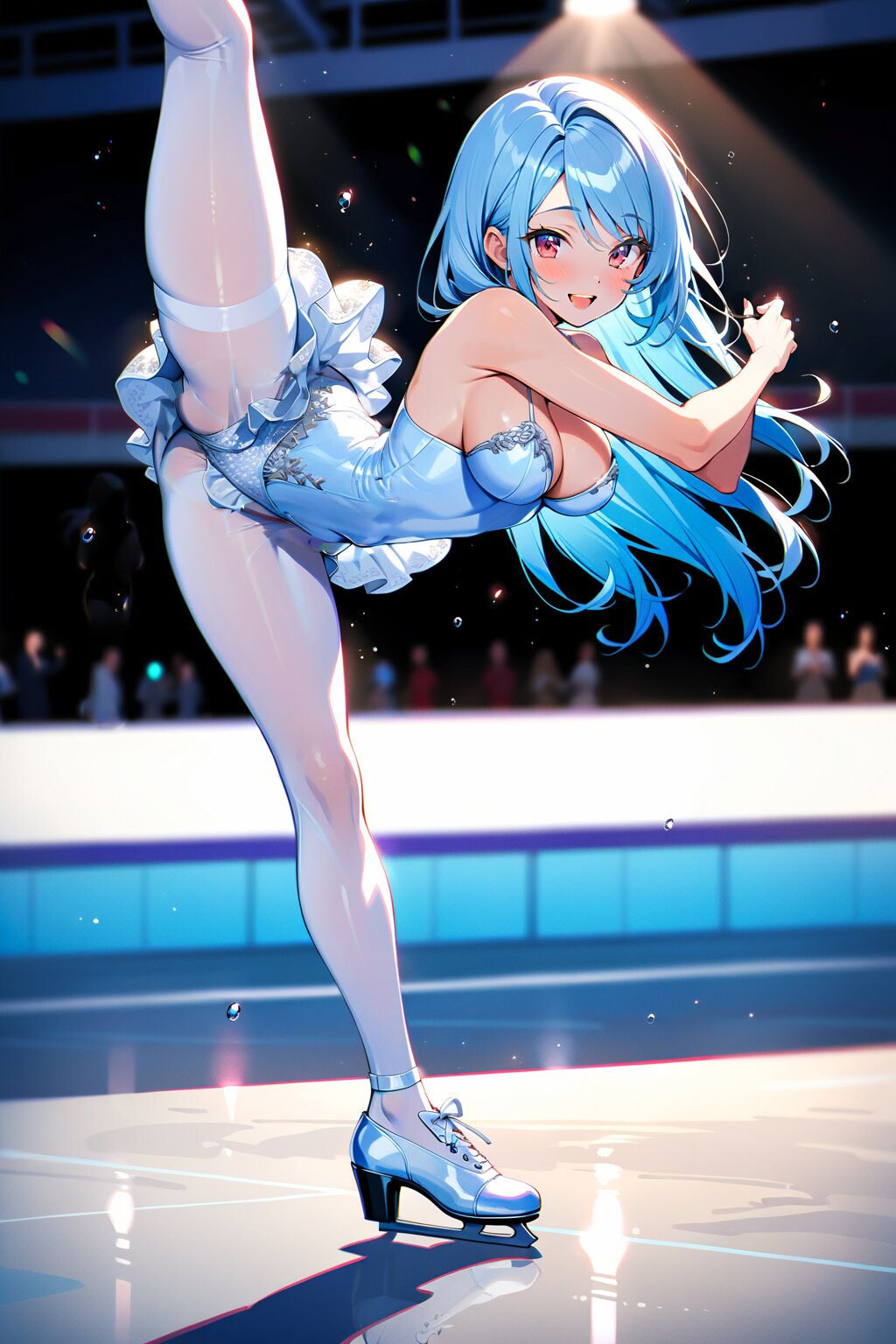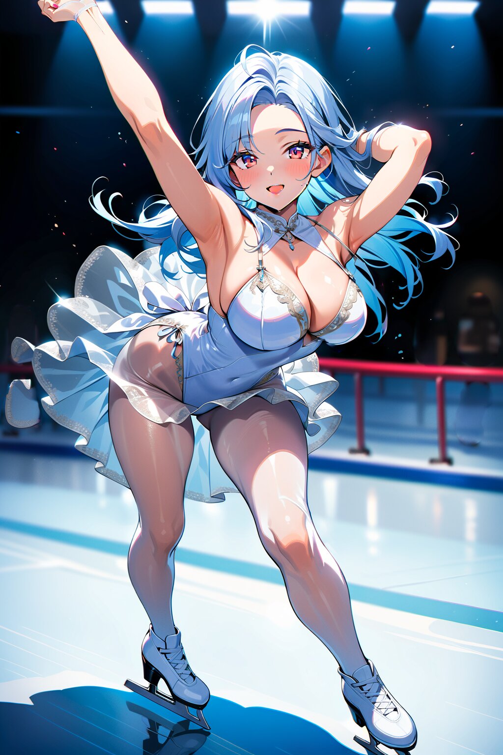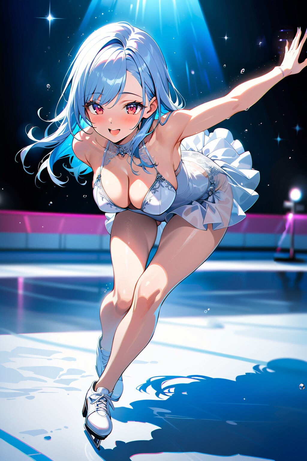(full body:1.4), 1girl, solo, ice skating, (figure skating:1.2), (stretching arm:1.2), (bending arm:1.2), from front, (skating toward:1.3), (leaning forward;1.1), (stretching leg:1.3), (stretching fingers:1.2), looking at viewer, (motion blur:1.3), (light aqua long hair:1.4), (straight long hair:1.5), (asymmetrical bangs:1.3), (red eyes:1.2), japanese girl, (large breasts:1.4), (shiny skin, gleaming skin:1.4), (smile:1.3), open mouth, blush, BREAK (white theme:1.5), (all white:1.5), (fusion of white leotard and (white [[see-through]] tulle skirt, white [[see-through]] tutu):1.4), ((No sleeve, bare shoulders):1.3), (A leotard that tightly covers the torso:1.4), (insane high leg:1.3), (white pantyhose that covers from the waist to the toes without any gaps:1.3), (white skating shoes:1.2), (high quality material with elegant texture and luster:1.3), (beautiful and detailed silver embroidery:1.2), indoor, (skating rink:1.2), (on the ice:1.2), spot light, colorful light, blue theme, depth of field, wind, blurry back ground, ((8K, masterpiece ,best quality ,ultra-detailed)), game cg, masterpiece, (perfect face:1.1025), (perfect hands:1.1025), (perfect legs:1.1025), (perfect arms:1.1025), (perfect fingers:1.1025), <lora:xl_more_art-full_v1:0.6> <lora:add-detail-xl:1>