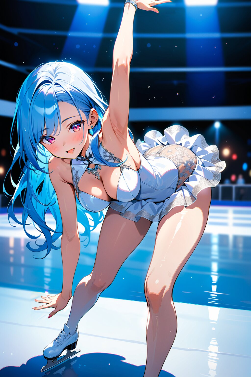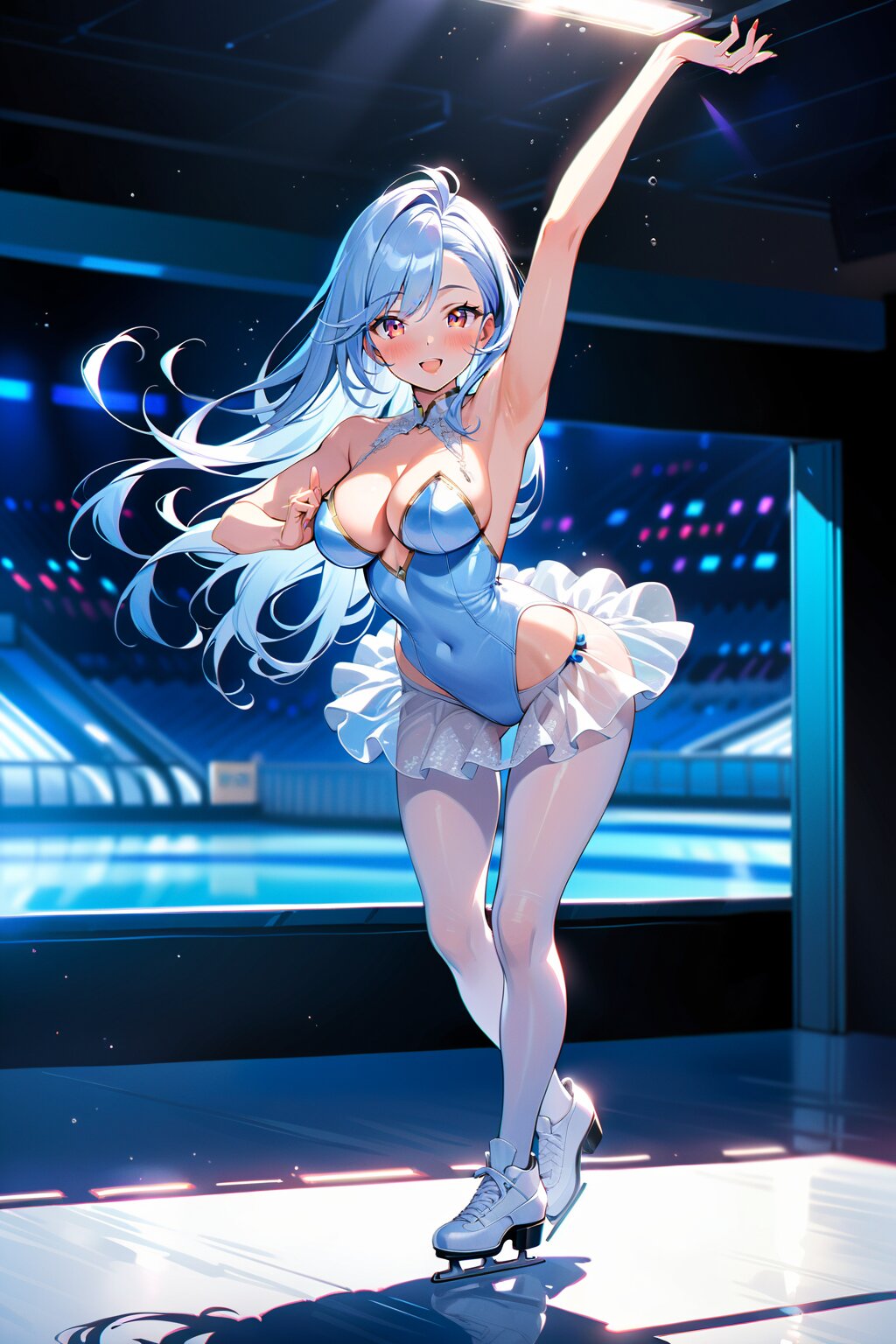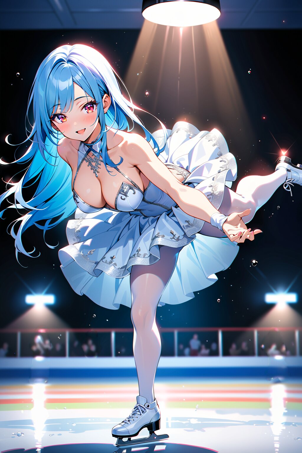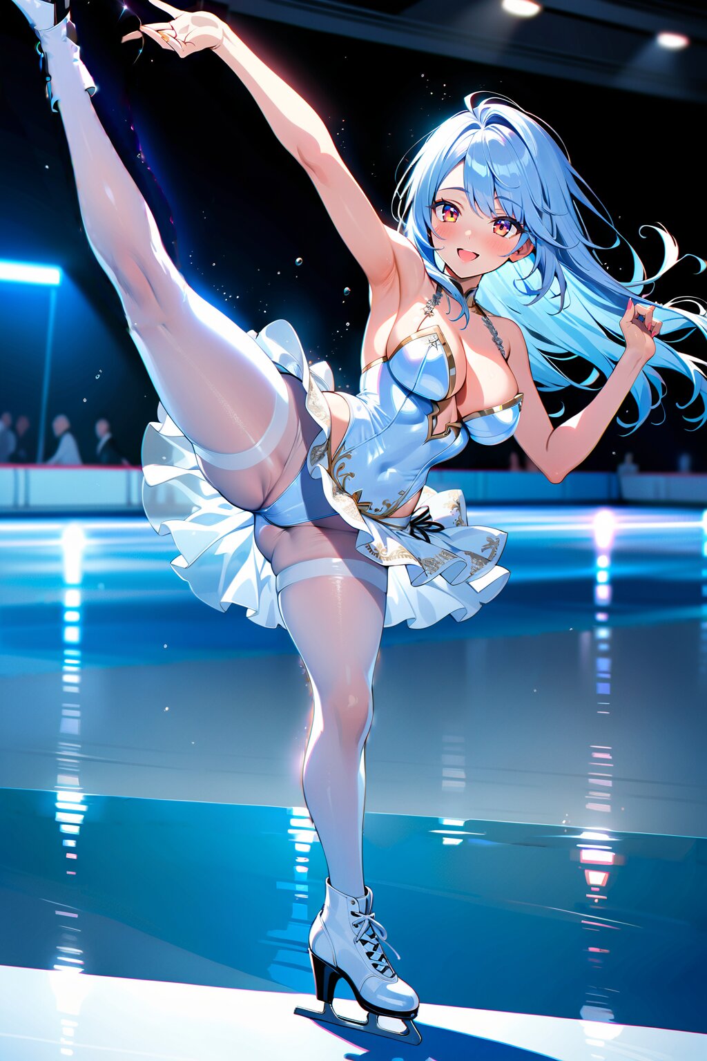 (full body:1.4), 1girl, solo, ice skating, (figure skating:1.2), (stretching arm:1.2), (bending arm:1.2), from front, (skating toward:1.3), (leaning forward;1.1), (stretching leg:1.3), (stretching fingers:1.2), looking at viewer, (motion blur:1.3), (light aqua long hair:1.4), (straight long hair:1.5), (asymmetrical bangs:1.3), (red eyes:1.2), japanese girl, (large breasts:1.4), (shiny skin, gleaming skin:1.4), (smile:1.3), open mouth, blush, BREAK (white theme:1.5), (all white:1.5), (fusion of white leotard and (white [[see-through]] tulle skirt, white [[see-through]] tutu):1.4), ((No sleeve, bare shoulders):1.3), (A leotard that tightly covers the torso:1.4), (insane high leg:1.3), (white pantyhose that covers from the waist to the toes without any gaps:1.3), (white skating shoes:1.2), (high quality material with elegant texture and luster:1.3), (beautiful and detailed silver embroidery:1.2), indoor, (skating rink:1.2), (on the ice:1.2), spot light, colorful light, blue theme, depth of field, wind, blurry back ground, ((8K, masterpiece ,best quality ,ultra-detailed)), game cg, masterpiece, (perfect face:1.1025), (perfect hands:1.1025), (perfect legs:1.1025), (perfect arms:1.1025), (perfect fingers:1.1025), <lora:xl_more_art-full_v1:0.6> <lora:add-detail-xl:1>