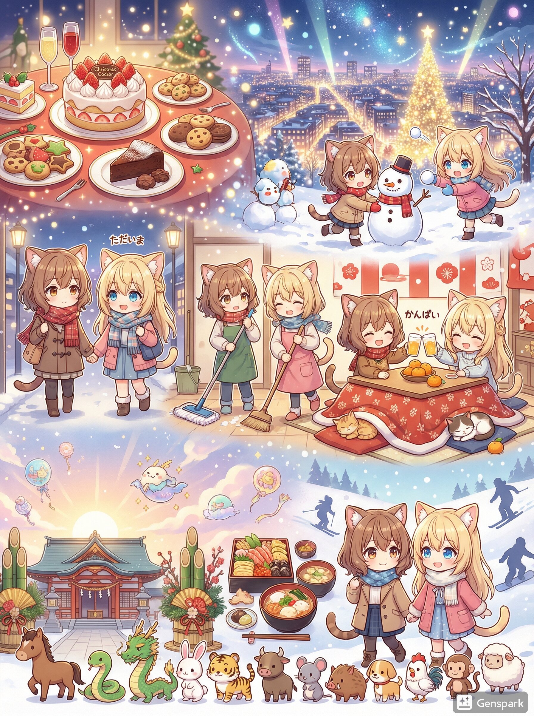 最高品質、精密な描写、アニメ調イラスト、 やわらかく美しい塗り、繊細な光表現、 情緒的で物語性のある一枚のイラスト 2人の猫耳の女の子、ミミとルルが登場する、 年末から年始へと時間が流れるような情景を ひとつながりの世界として描いた一枚絵 ミミ: 茶髪の猫耳娘、落ち着いた雰囲気、優しく穏やかな表情 ルル: 金髪の猫耳娘、明るく華やかな雰囲気、親しみやすい笑顔 縦長構図、 境界線のない連続した風景、 空気と光が自然に移ろい、 奥から手前へ、夜から朝へと時間が流れていく構成 画面の奥側には、 クリスマスケーキ、クッキー、ガトーショコラが並ぶ ホリデースイーツのテーブル、 イルミネーションが輝く聖夜の街並み、 幻想的な光と舞う雪、 楽しそうに雪合戦や雪だるま作りをする 可愛らしい雪遊びの風景 画面の中心付近には、 マフラー姿で帰り道を歩く「ただいま」の情景、 年末の大そうじをするミミとルル、 モップやほうきを手にした生活感のある姿、 こたつでぬくぬく過ごす時間、 毛布、みかん、丸まって眠る猫ちゃん、 グラスを手にしたささやかな乾杯のひととき、 赤と白を基調にした小物や衣装が彩る紅白フェスの雰囲気 画面の手前側には、 初日の出が差し込む新年の朝、 やわらかな光に包まれた空気、 初詣とお正月飾り、 おせち料理とお雑煮、 初夢をイメージした幻想的なモチーフが空に浮かび、 十二支(馬、蛇、龍、兎、虎、牛、鼠、猪、犬、鶏、猿、羊)が 可愛らしく行進するパレード、 冬のおでかけコーデを身にまとったミミとルル、 背景にはスキーやスノーボードを楽しむ ウィンタースポーツのシルエット 全体を通して温かさときらめきを感じる色彩設計、 ミミとルルの仲の良さが自然に伝わる、 年末年始の空気と時間を一枚に閉じ込めた物語的なイラスト