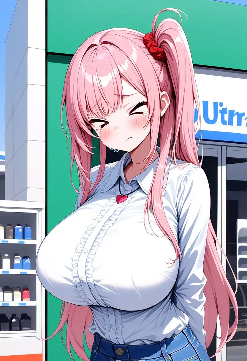 masterpiece, best quality, ultra detailed, 8K, [> <]++, [tears]++, [blouse]++, [upper body]++, [huge breasts]++, perky breasts, hanging breasts, curvy, heart necklace, long sleeves, tall, [long hair]++, [straight hair]++, [shiny]+, [shiny skin]+, [shiny clothes]+, blush, closed mouth, [In front of the convenience store]++, car, outdoors, day, [high side ponytail]++,
