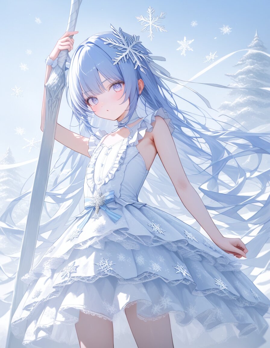 cowboy shot,1girl,solo,loli petite girl warrior,short body,flat chest,small breasts,cute childlike face with sharp intense eyes,long hair,powerful stance holding enormous nodachi with both hands diagonally,(very wide thick blade:1.4),(extremely broad flat blade:1.4),(blade wider than girl's torso:1.3),huge oversized nodachi taller than her height,(thick broad katana blade:1.3) featuring intricate wavy hamon shaped like hexagonal snowflakes and six-petal ice crystals,visible white temper line,faint hoarfrost on surface,ultra detailed steel grain and small hands gripping hilt tightly,anime style realistic sword,wearing frilly snow-themed dress,icy blue and white color palette,elaborate lace trims,multi-layered ruffles,delicate snowflake motifs on fabric,lolita fashion with winter elements,masterpiece,best quality,absurdres,high score,