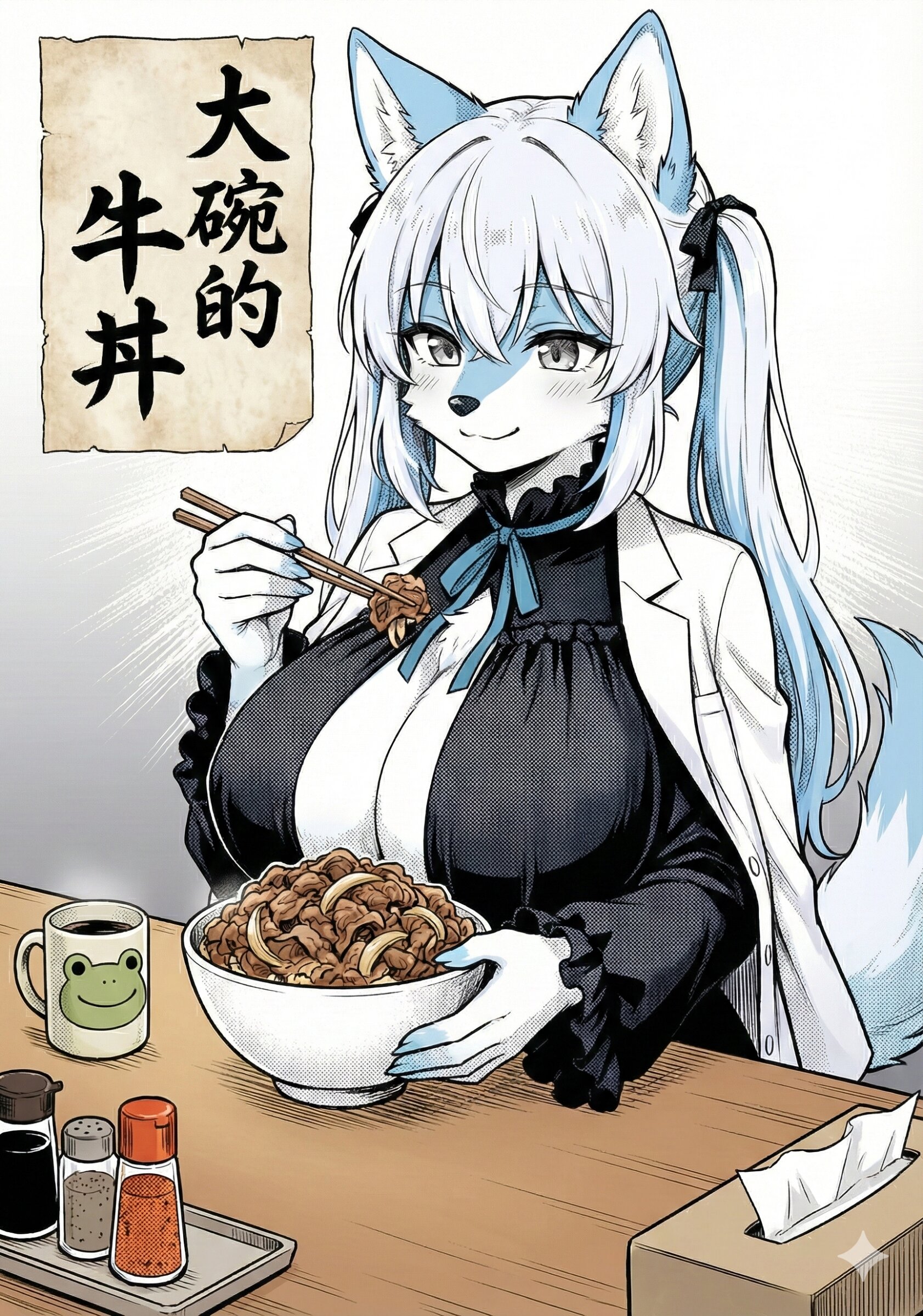 イラストのキャラクターをGペンでペン入れする。2D。フルカラー。トーンを貼っている。強めの陰影とコントラスト。線は細く薄くする。バストとヒップがとても豊満。キャラクターはオオカミのケモノ。キャラクターの特徴をそのままに、ポーズを完全に変更。腰が細い。キャラクターは銀色の瞳。微笑む。遠近感を持たせる。衣服はそのまま。椅子に座って、食器に入った大盛牛丼を箸で食べている。手に持っている食器は白い。テーブルの上にカエルの顔が描かれたマグカップ。テーブルに置かれたお盆の上に、胡椒、唐辛子、ティッシュ箱が纏めて置かれている。キャラクターは牛丼に視線を向けている。背景は白。グラデーションを追加。