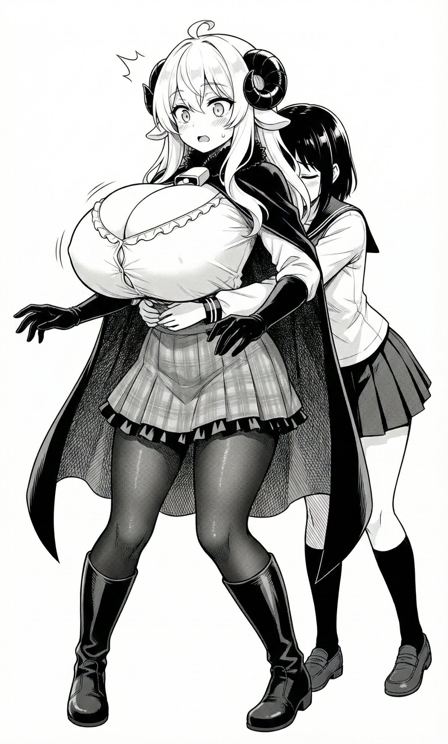 イラストのキャラクターをGペンでペン入れする。2D。カラー。背景にトーンを貼っている。強めの陰影とコントラスト。線は細く薄くする。バストとヒップがとても豊満。腰が細い。gigantic breasts。キャラクターの特徴をそのままに、構図とポーズを変更する。背景は白。立ちながら女子生徒に背後から抱きつかれて少し驚く。キャラクターはブーツを履いている。肩に掛かっている鞄を削除。キャラクターの髪色は純白、目は銀色、羊角は黒。陰影はペン書き。完全に新しいイラスト。グラデーションを追加。