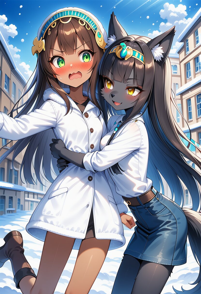 ネイトちゃん、競スクだったり冬服だったり両極端な格好をしてもらいました。ビス子ちゃんは自前の毛皮があるので比較的薄着です。