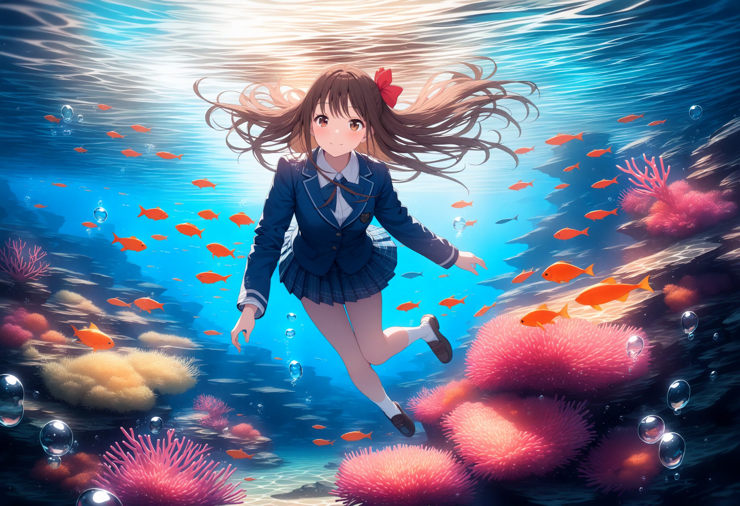 High resolution, Super detailed, Best Quality, masterpiece, 8K, 4K, beautiful background, the best aesthetics, underwater, BREAK , 1girl, 17yo,long hair, brown hair, brown eyes, half up,school uniform, hair bow,happy smile,full body,with loafers,with white socks,blue blazer,full clothes,swimming, BREAK , surrounded by tropical fish, coral reef, bubbles, underwater scene, diffused sunlight, caustics, bluish tint, soft shadows, slightly desaturated colors, underwater haze, floating particles, subsurface scattering, refracted light, soft contrast, natural lighting,