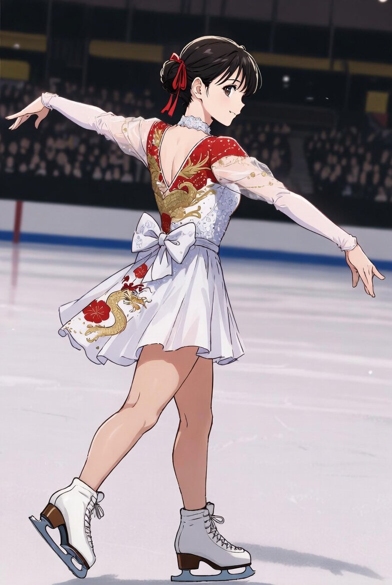 イラスト:A 20-year-old Japanese woman at a skating rink, skating in a figure skating dress with New Year's motifs printed on it, in a dynamic pose on ice.