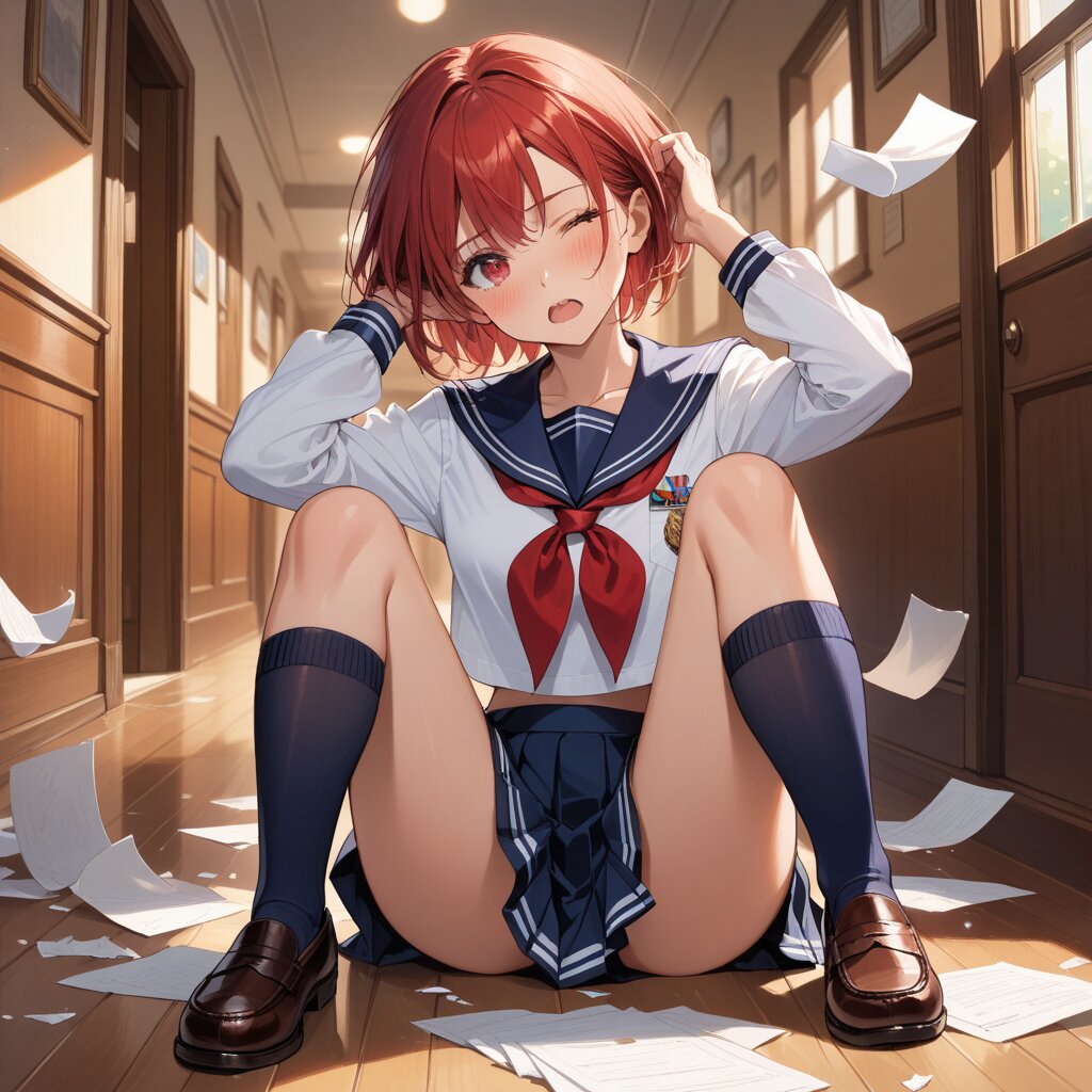 Best quality, Masterpieces, Female high school student wearing (navy sailor school uniform:1.5), red hair, short hair, red eyes, (beautiful eyes), small breasts, flushed cheeks, slightly open mouth, {{{{school uniform}}}}, serafuku, long sleeves, white shirt, pleated skirt, detailed clothes, socks, loafers, detailed panties, 1girl, solo, sitting, (pain:1.2), (tears:0.8), (hand on head:1.1), leaning back, (knees up:1.1), open legs, navel, straight-on, beautiful detailed face, detailed eyes, one eye closed, (clenched mouth:0.6), head tilt, (blush:1.1), beautiful detailed skin, warm lighting, detailed shading, (blurry foreground:1.2), (falling paper:1.4), messy floor, indoors, school, (hallway:1.1), {{{{masterpiece}}}}, best quality, high quality, highres, official art, official style, extremely detailed, ultra detailed, absurdres