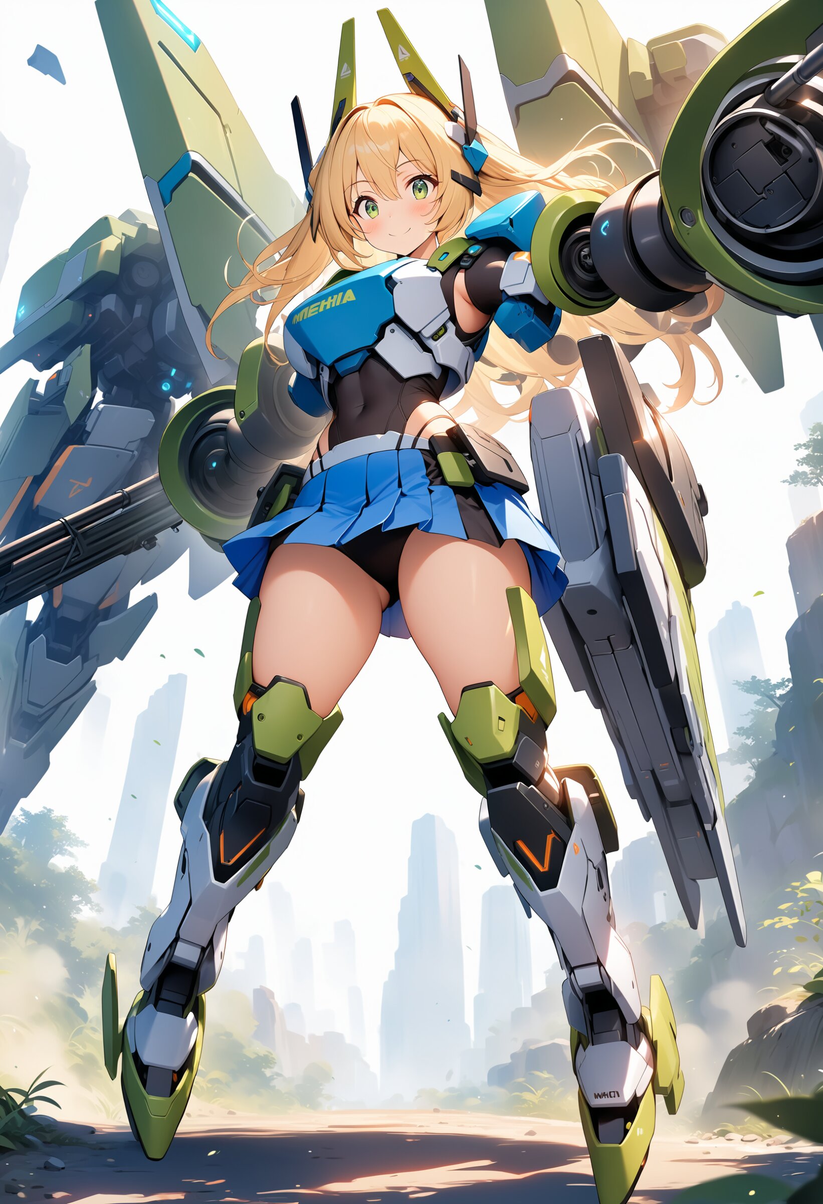 1girl, ((white background)), ultra detailed 8k cg render, masterpiece, high resolution, extremely detailed, mecha musume,mecha shoulder, mech leg, headgear, mecha armor, ((mini skirt)),long blonde hair, dropping green eyes, smile, dynamic posing,