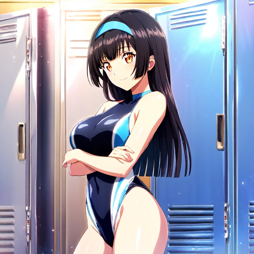 ((masterpiece)), ((best quality)), (ultra-detailed),anime style,cowboy shot, locker room, a cute girl, 1girl, large bust, ((Black Racing-style swimsuit)), beautiful black hair, beautiful orange eyes, ((beautiful eyes)),straight hair, (blunt hair), ((blue hairband)), happy,hand on own elbow