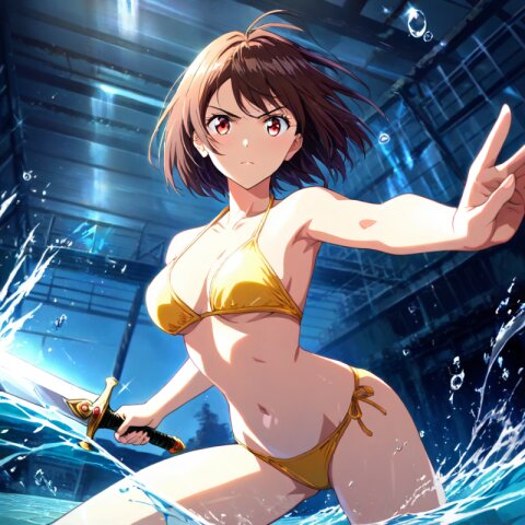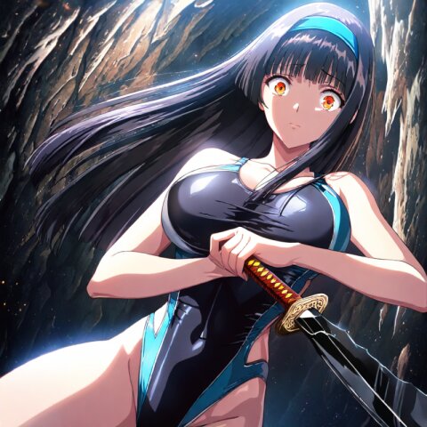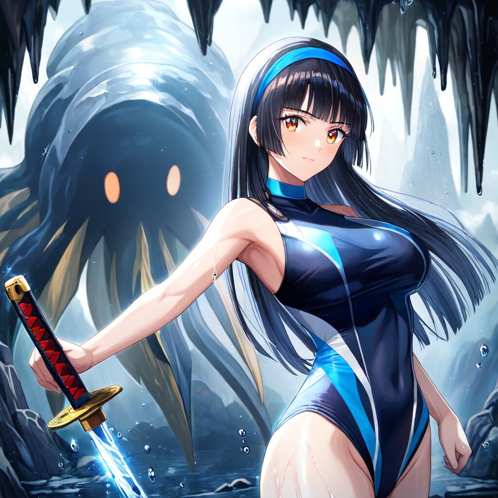 ((masterpiece)), ((best quality)), (ultra-detailed),anime style,a cute girl, large bust, ((Black Racing-style swimsuit)), beautiful black hair, beautiful orange eyes, ((beautiful eyes)),straight hair, (blunt hair), ((blue hairband)), Holding a katana in hand.Facing her, oversized animal,octopus, turned,standing in front of her.Dark underground cave, stalactites, water droplets