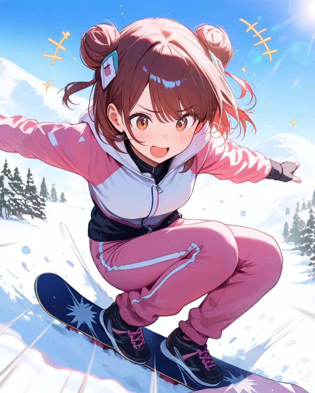 1girl, pink straight short hair, double bun, hair ornament, brown eyes, sportswear, excited, open mouth, snow mountain, snowboarding, sliding down the slope, sparkling aura, +++, motion lines, emphasis lines, clear sky, sunlight, lens flare, masterpiece, absurdres, high score, great score