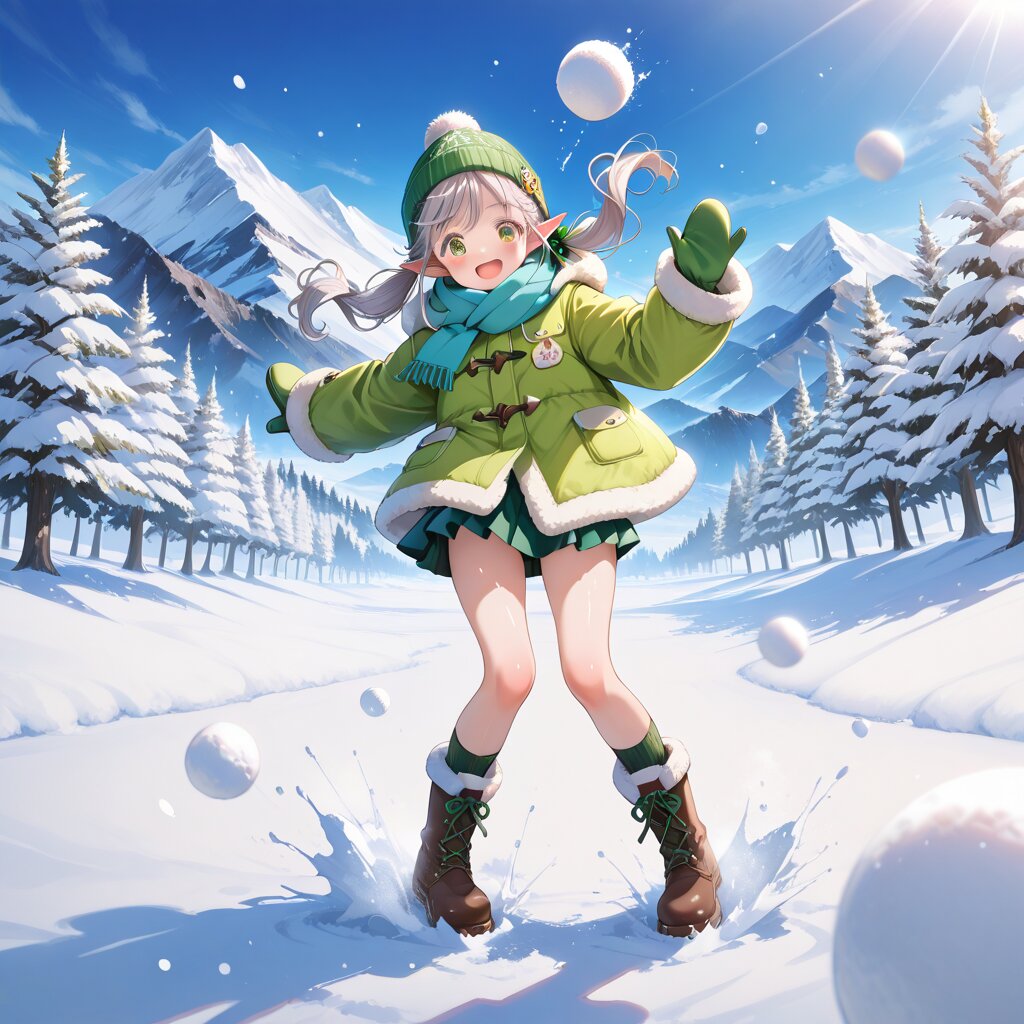 (masterpiece,high resolusion,illustration,ultra detailed 8k art,extremely detailed CG,official art,clothes reflecting light,detailed shiny skin,detailed background:1.3), ((highly detailed beautiful face and eyes)),(loli:2.0),(fullbody shot:1.4),nsfw,masterpiece, best quality, 748cmstyle,chimborazo,mountain,landscape,no humans,,,nsfw,masterpiece, best quality, 1girl, loli elf girl, cute, silver hair, twintails with emerald green ribbons, emerald green to purple gradient eyes sparkling like stardust,A lively and dynamic scene of three cute anime-style girls having an intense snowball fight in a snowy park, action-packed composition with low-angle perspective looking slightly up to emphasize energy and excitement, one girl in the foreground throwing a snowball with full force, arm pulled back and snow particles flying, joyful laughing expression, another girl mid-dodge leaning sideways with surprised wide eyes, third girl in the background preparing to throw, snowballs in mid-air, snow exploding on impact near them, powder snow spraying everywhere, wind blowing their hair and scarves, all wearing colorful winter clothes, fluffy coats, mittens, boots, knit hats with pom-poms, rosy cheeks from the cold, beautiful winter landscape with fresh deep snow, snow-covered pine trees, soft sunlight filtering through clouds creating sparkling snow particles in the air, clear crisp winter atmosphere, highly detailed, cinematic lighting, depth of field, motion blur on flying snowballs, masterpiece, best quality, 8k