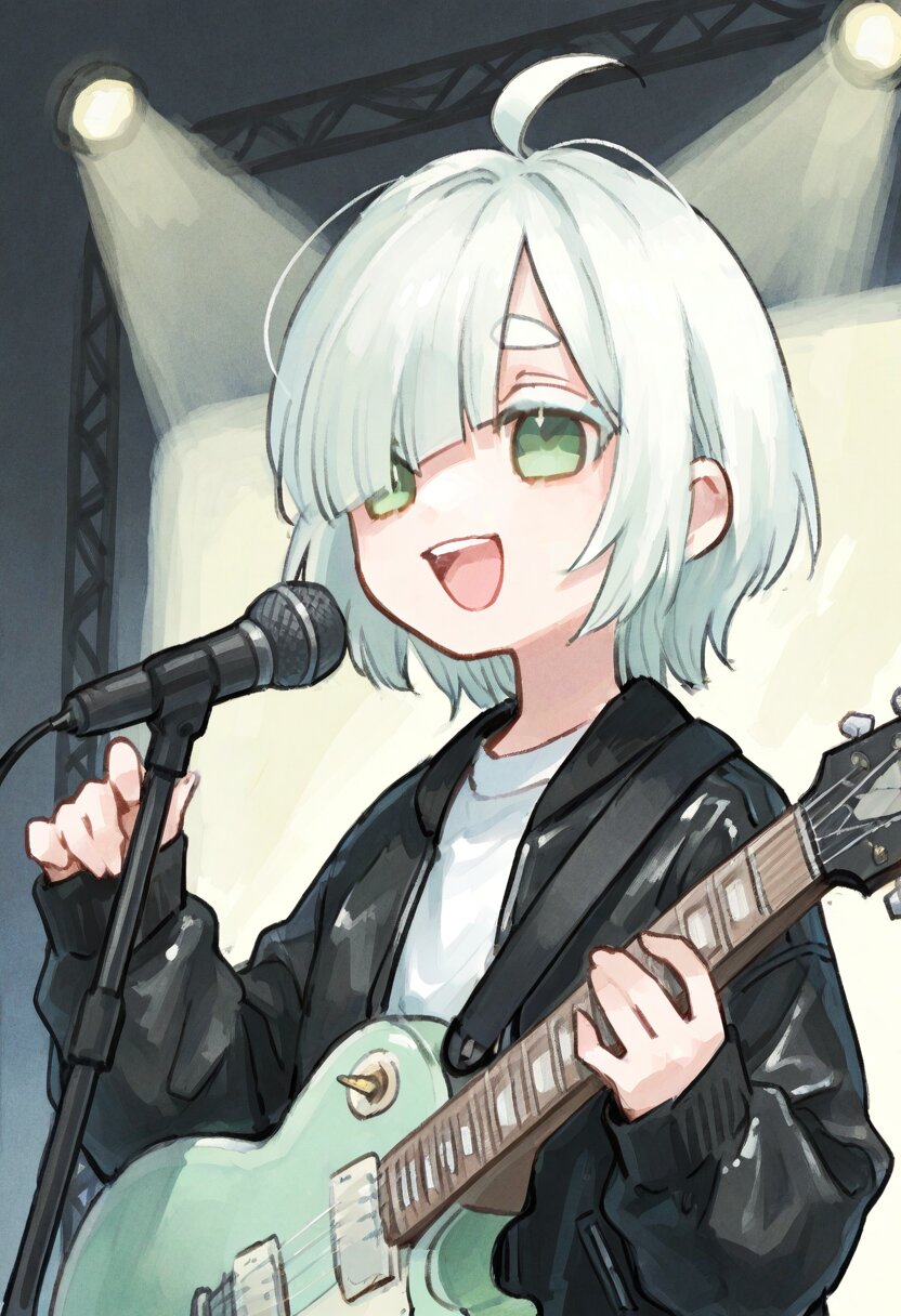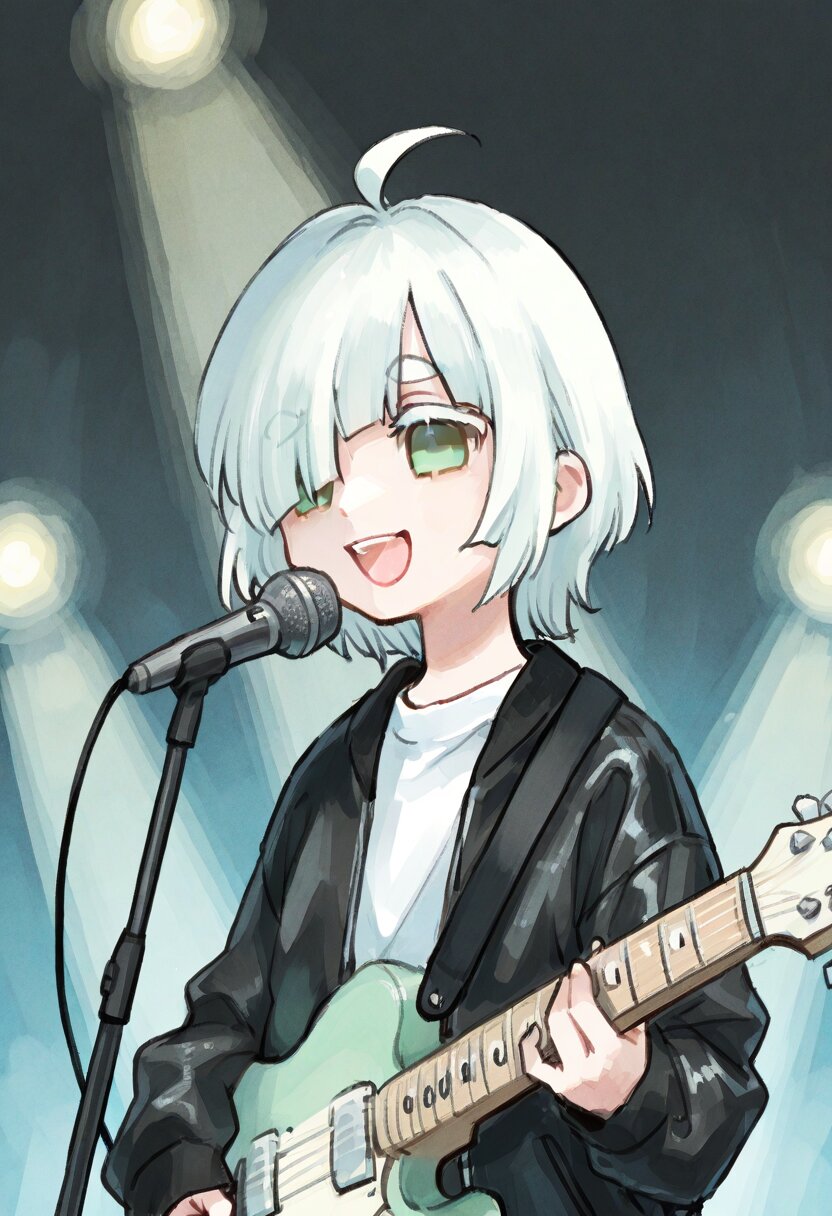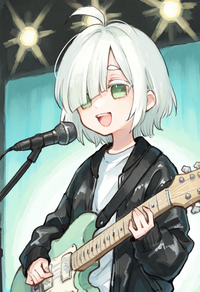 <lora:inmnstyleilxl:0.9>, ultra-detailed, best quality, masterpiece, very aesthetic, watercolor painting, general, chibi, solo 1girl, stage, stage light, playing red electric guitar, stand microphone, smile, open mouth, oversize black leather jacket, sleeves past wrists, white shirt, upper body, (bright white hair), short hair, blunt bangs, white thick eyebrow, white colored eyelashes, (hair over one eye), ahoge, mint green eyes