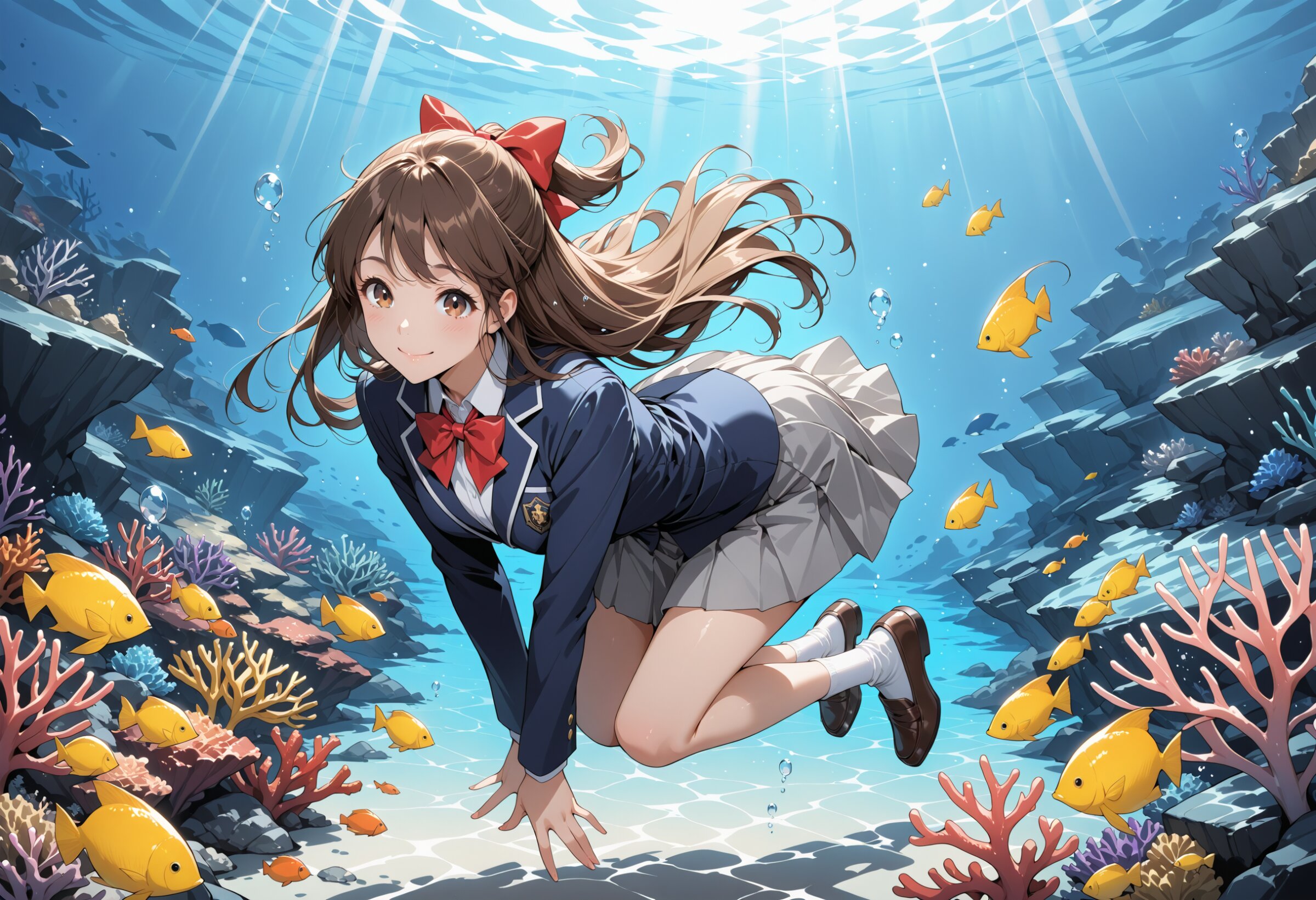 High resolution, Super detailed, Best Quality, masterpiece, 8K, 4K, beautiful background, the best aesthetics, BREAK 1girl, 17yo,long hair, brown hair, brown eyes,half up, school uniform, hair bow,happy smile,full body, with loafers,with white socks,blue blazer,full clothes,swimming in the water, BREAK surrounded by tropical fish, coral reef, bubbles, underwater scene, diffused sunlight, caustics, bluish tint, soft shadows, slightly desaturated colors, underwater haze, floating particles, subsurface scattering, refracted light, soft contrast, natural lighting,