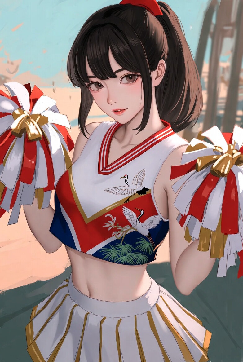イラスト: A 18-year-old Japanese woman cheerleader, wearing a uniform with New Year's motifs from Japan, holding pom-poms in both hands.