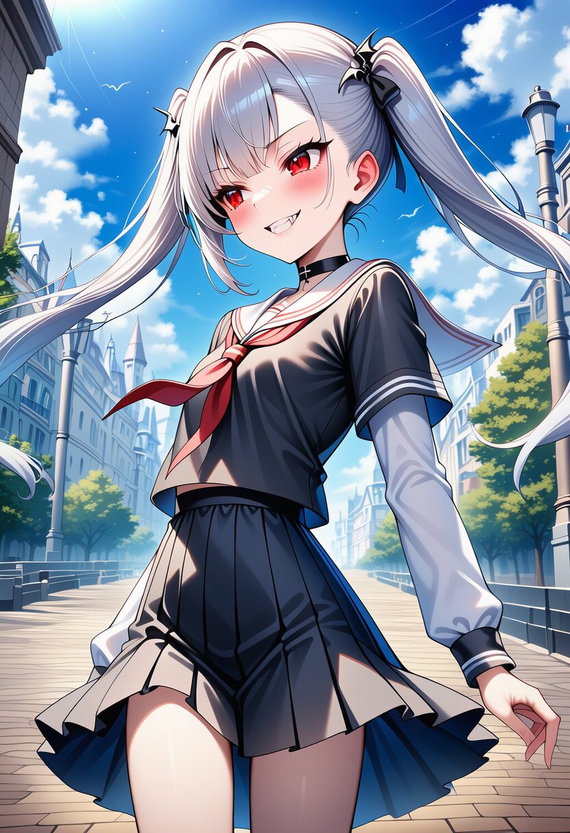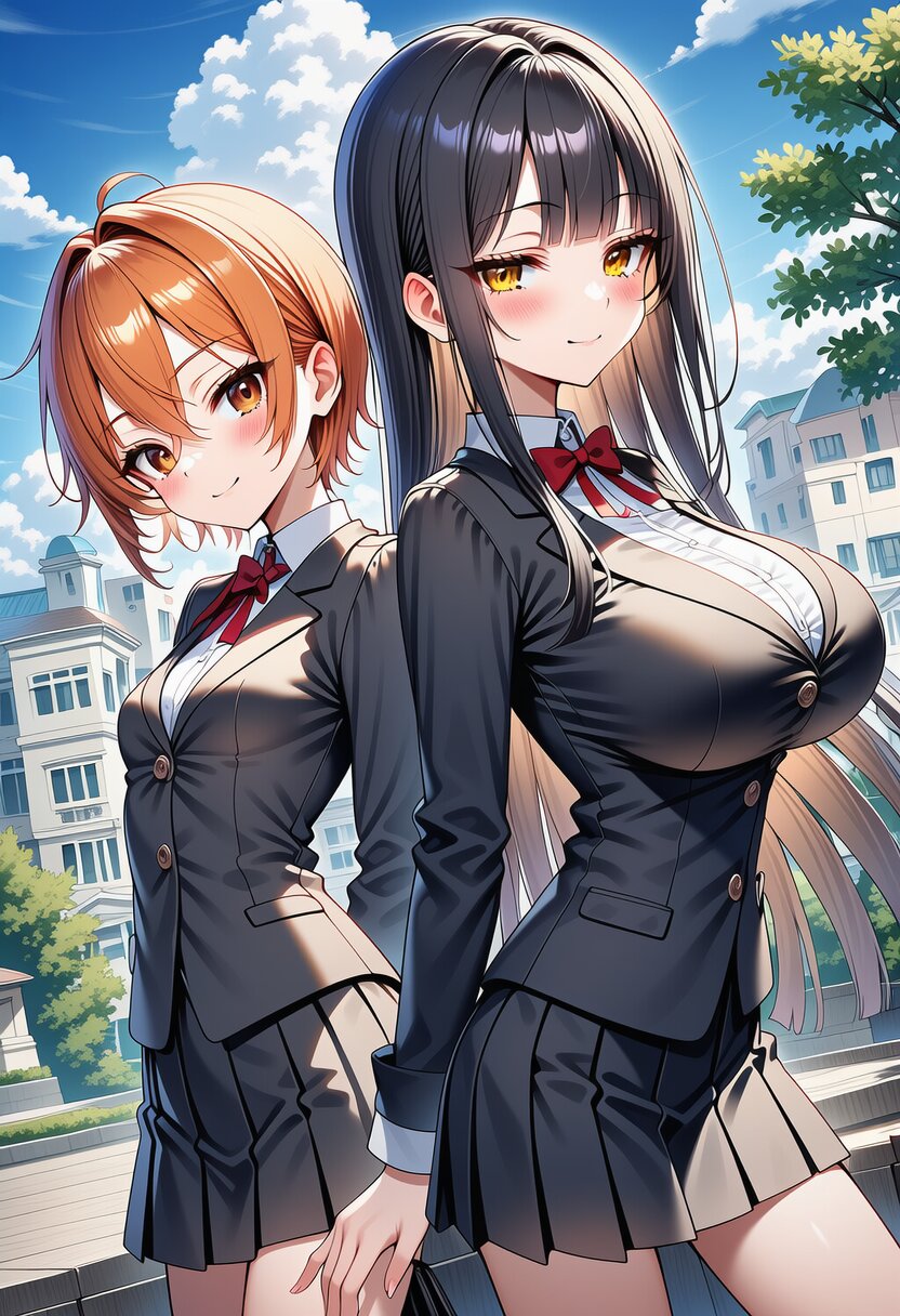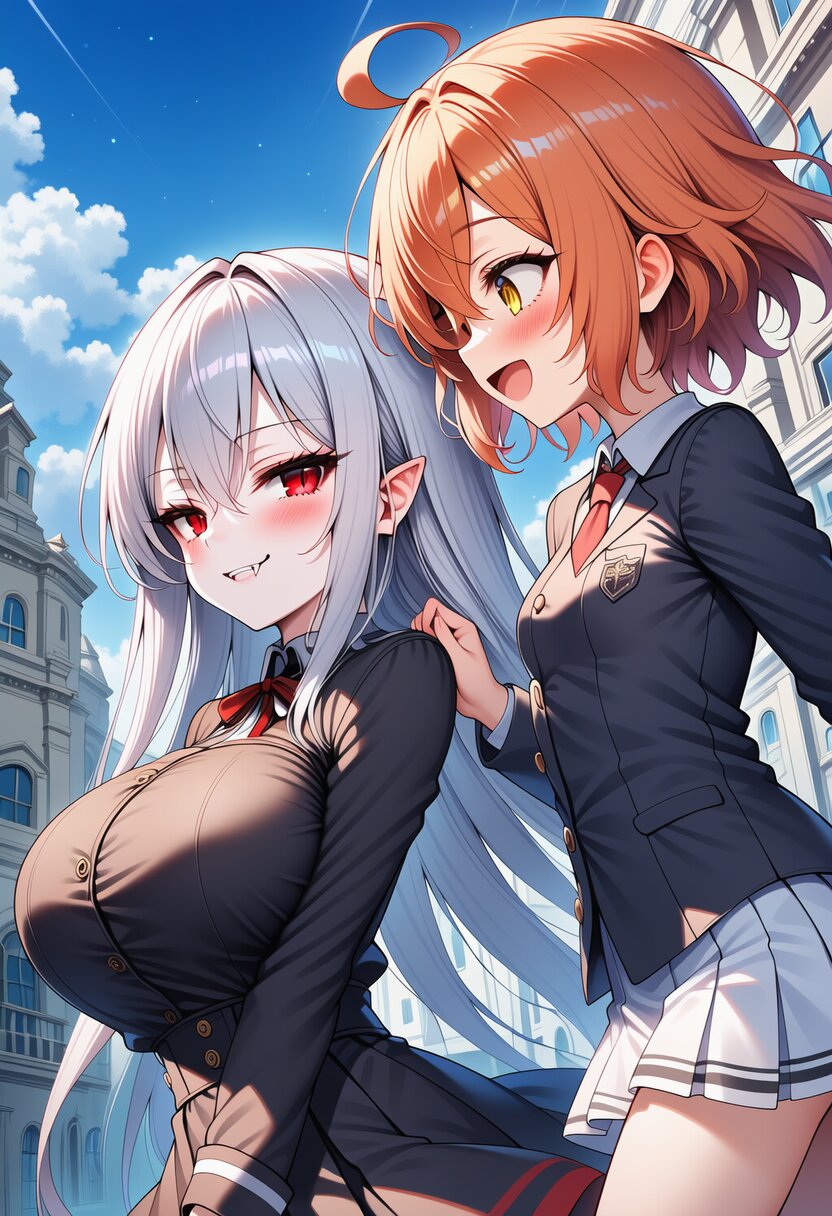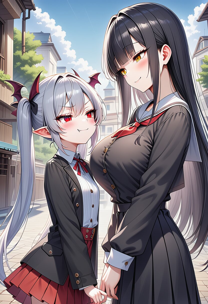 ai-generated, year 2024, anime style, 2girl, side by side, kawaii posing, midday, outdoor, in modern town, dynamic angle, masterpiece, best quality, ultra detailed, perfect fingers, high resolution, absurdres, perfect anotomy, detailed background, unity 8k wallpaper, location, very aesthetic, masterpiece, no text