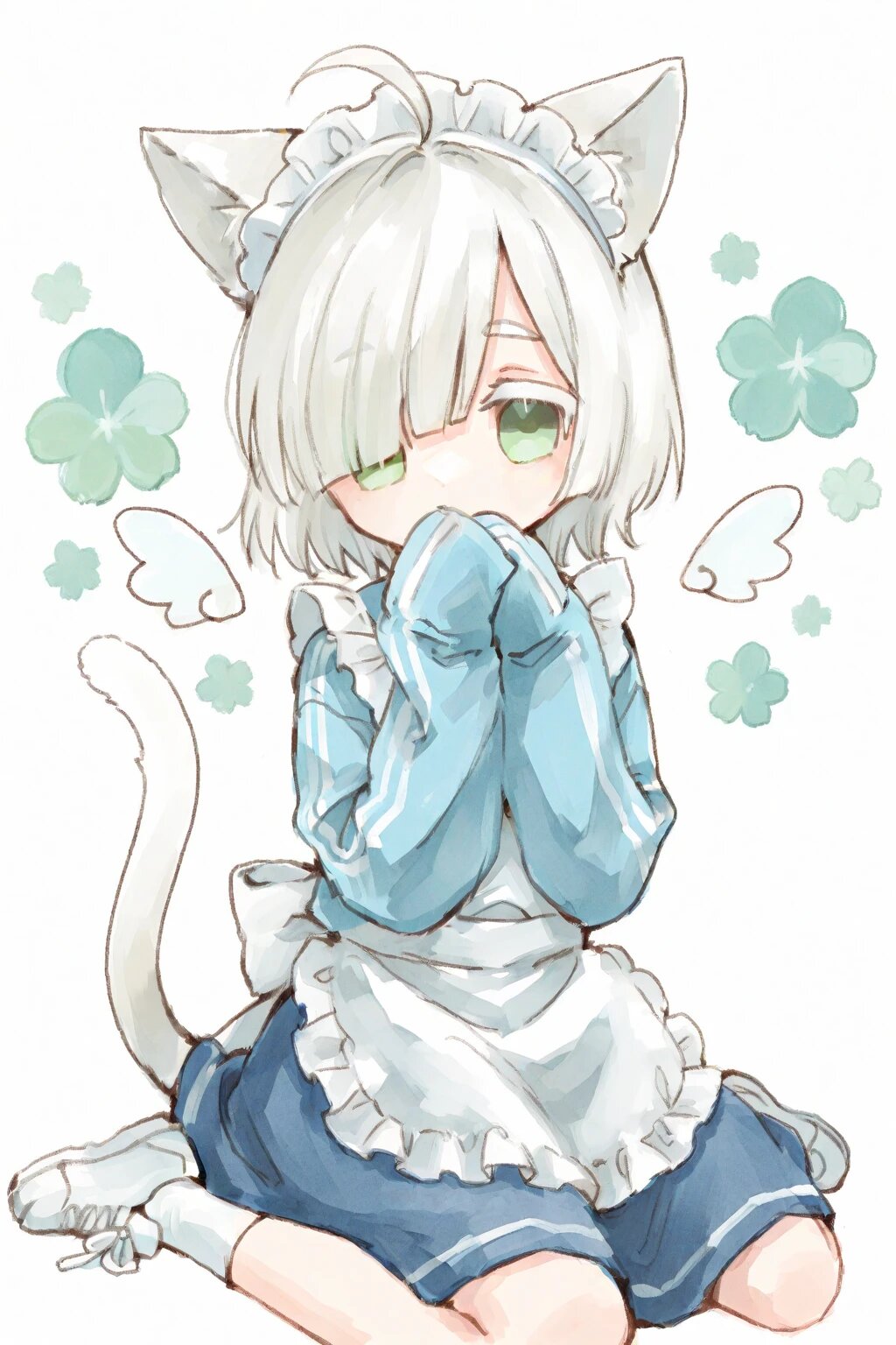 ultra-detailed, best quality, masterpiece, very aesthetic, watercolor painting, general, chibi, solo, 1girl, detached wings, maid head dress with cat ears, blue track top, long sleeves, sleeves past fingers, blue flare skirt decorated with white ruffles, white frilly apron, cat tail, sleeves, covered mouth, white socks, white sneaker, (bright white hair), short hair, blunt bangs, white thick eyebrow, white colored eyelashes, (hair over one eye), ahoge, mint green eyes, wariza