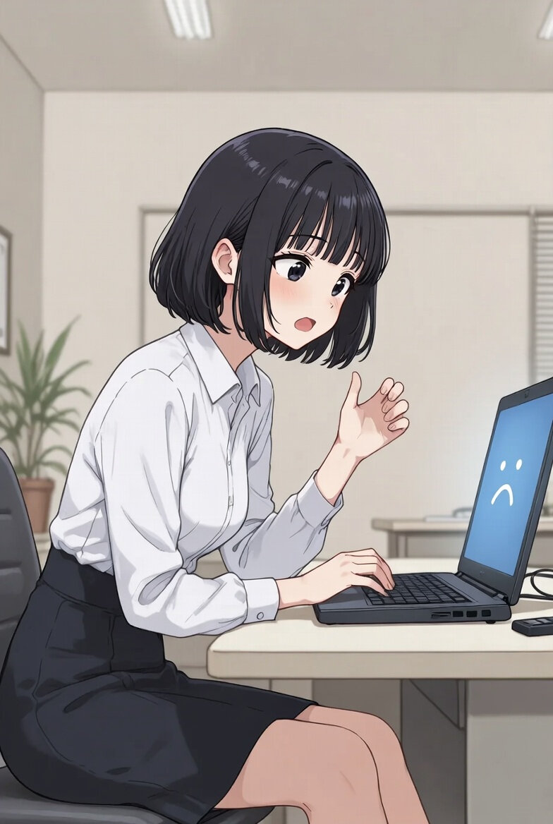 An illustration of a 28-year-old Japanese woman, an office worker, encountering a blue screen while operating a laptop. She is seated on a chair at a desk in a Japanese corporate office, with a laptop placed on the desk, and she has a bewildered expression on her face.