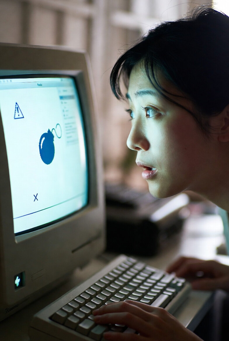 AppleのパソコンMacintoshに表示されている爆弾マーク。その画面を見ている日本人女性22歳の写真。途方に暮れている表情。
