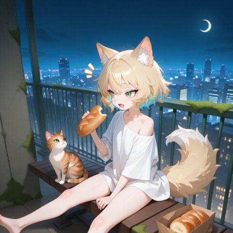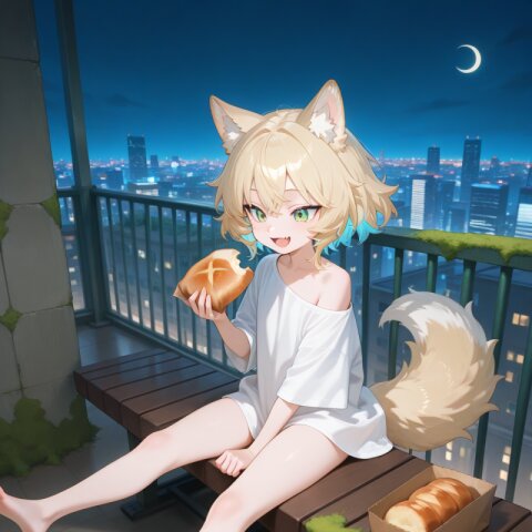 1girl, sensitive, facing to the side, solo, cute, day, outdoors, roof, skyline, cityscape, sleeping, wolf girl, wolf ears, wolf tail, blonde tail, colored inner hair, blonde hair, blue hair, short hair, fluffy hair, flat chest, fang, oversized shirt, bottomless, sleeves past wrists, single bare shoulder, :o, lying, fetal position, moss, zzz, = =, masterpiece, best quality, amazing quality,