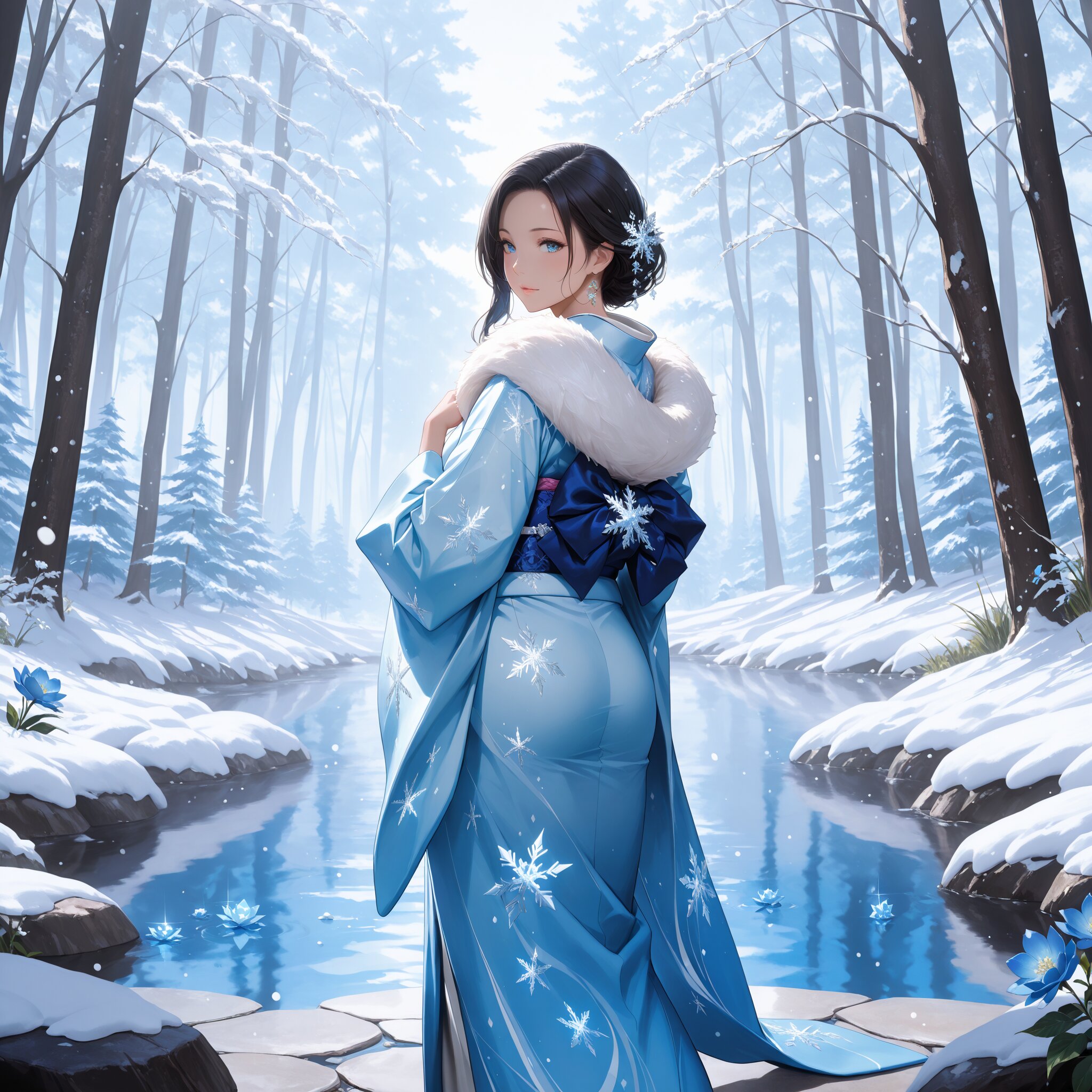 masterpiece, best quality, photorealistic, sharp focus, cinematic lighting, depth of field, beautiful composition, vibrant colors, ultra high res, 8K, highly detailed, masterpiece, best quality, very detailed, (masterpiece:1.2), (best quality), (ultra-detailed), 1girl, solo, mature beautiful woman, long dark hair with intricate blue flower ornaments, looking back over shoulder, serene expression, wearing an elegant blue winter kimono with silver snowflake patterns, white fur boa, standing by a crystal-clear pond, snow-covered forest background, diamond dust sparkling in the air, soft diffused light, winter fantasy aesthetic, extremely detailed textures, sharp focus.