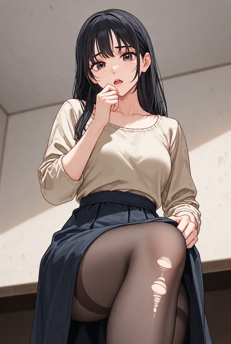 イラスト。すねのパンティストッキングの伝線に気がついた日本人女性。