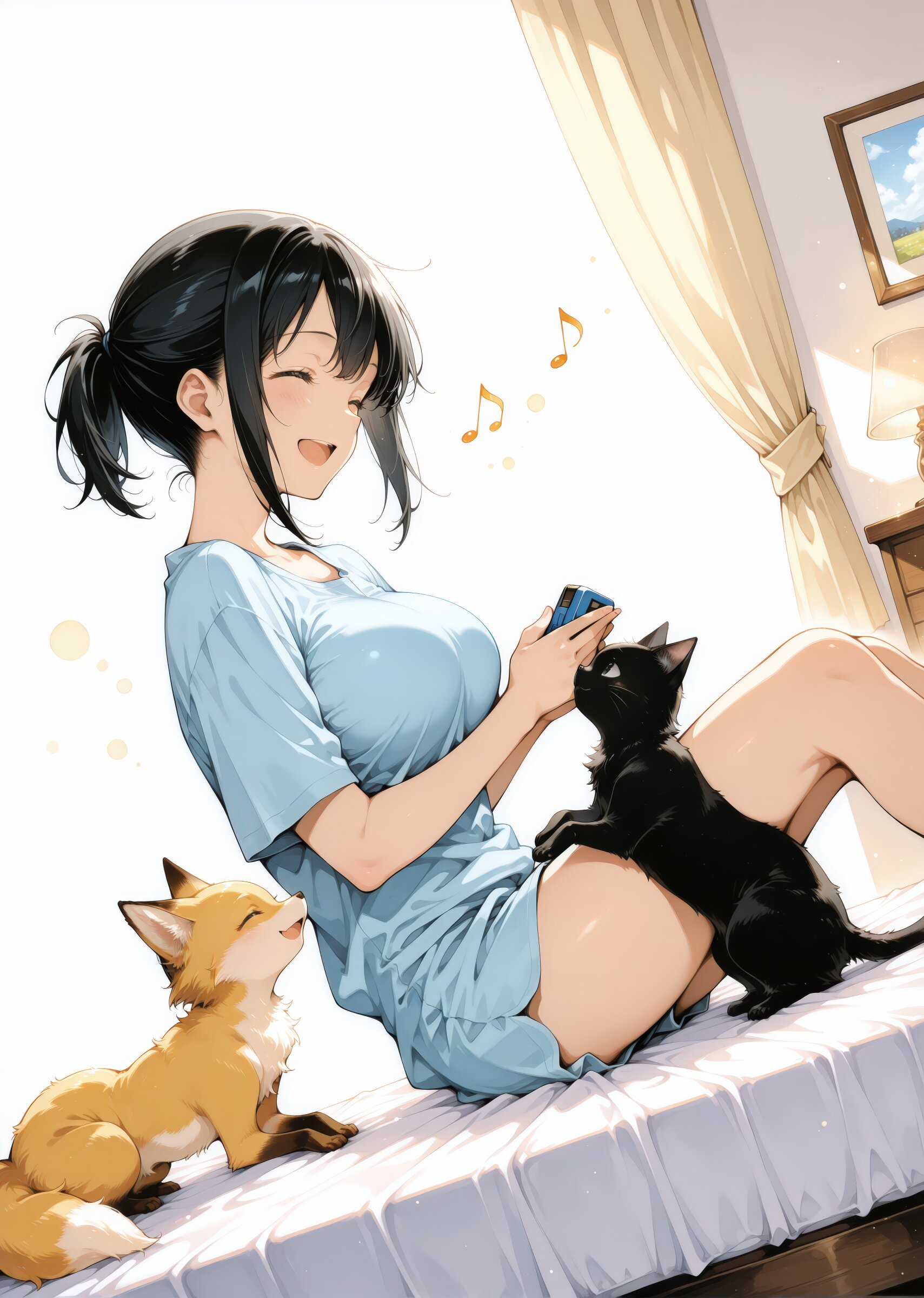 Best quality, Masterpieces, simple background, negative space, anime-style illustration, white background, fine detail, A girl listens to music through speakers, holding a small Sony Walkman in her hands., 1girl and 2animals, 1girl, (young girl), cute face and eyes, big breasts, black hair, clear black eyes, single short ponytail hair, cute and lovely, Vigorous, lively, and spontaneous personality, smile, open mouth, closed eyes, sitting , leaning back with both hands behind, legs stretched out in front, head slightly tilted back, cinematic angle, dutch angle, from side, bokeh, cute small fox cub, a black cat, happy, joyful, music wave background, soft lines and music notes, minimal, light background, simple girl's bedroom background, bed with soft sheets, curtains, cozy and neat