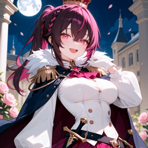 1girl, a stunning female samurai with delicate facial features, detailed amber eyes with gem-like pupils, and a cheerful grin stands proudly in a Japanese palace garden at night. She has sleek black hair tied in a low ponytail, adorned with cute cat ears that twitch playfully. Her (Red luxurious Prince costume:1.6) features intricate embroidery and long flowing sleeves, paired with a (luxurious Black Cape:1.3) that billows dramatically behind her. She wears a (luxurious Red mini skirt:1.4) with elegant pleats and (Black luxurious Boots:1.3) that reach her thighs. A gleaming (Katana on waist:1.3) rests at her hip, its hilt wrapped in crimson silk. Atop her head sits a (luxurious crown on head:1.4), shimmering under the moonlight. The background showcases traditional Japanese architecture with wooden beams and paper lanterns casting a soft glow, surrounded by blooming cherry blossoms and scattered petals. The night sky is filled with stars, and a full moon bathes the scene in silvery light, enhancing the romantic yet mysterious atmosphere. Her pose exudes confidence and charm, blending warrior elegance with princely grace.