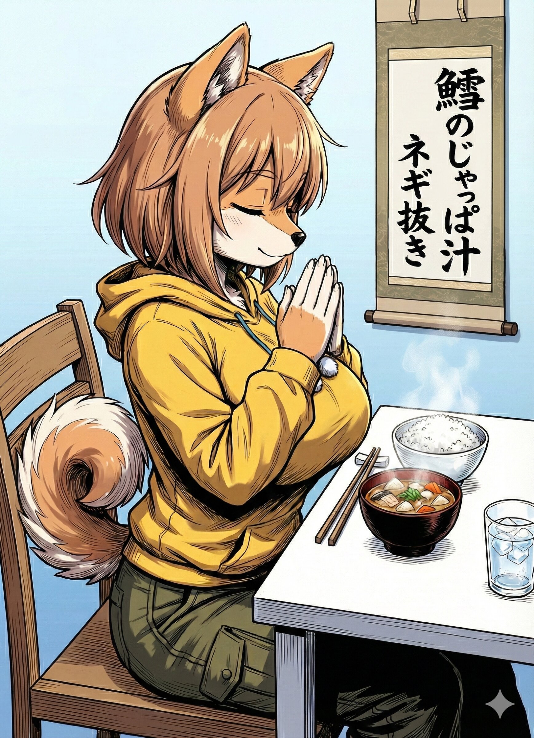 イラストのキャラクターをGペンでペン入れする。2D。カラー。濃いトーンを貼っている。強めの影とコントラスト。線は細く薄くする。バストがとても豊満。帽子を外している。参照イラストのキャラクターをそのまま使ってポーズを変更。毛並みはモフモフ。キャラクターは柴犬の耳と丸まった尻尾を持つ。背景は水色。キャラクターを側面から見る。キャラクターが前方の白飯と鱈のじゃっぱ汁に対して食事前の合掌をしているイラスト生成。キャラクターは椅子に座って、目を閉じて合掌している。白飯の食器は白い。じゃっぱ汁の食器はお椀で、白いテーブルに置いてある。真鱈のあら、ニンジン、大根、味噌が入っている鱈のじゃっぱ汁。湯気が立っている鱈のじゃっぱ汁。箸がテーブルに置いてある。食器の隣に氷水が入ったガラスのコップ。グラデーションを追加。 ▶︎右上に「鱈のじゃっぱ汁 ネギ抜き」と墨で書かれている掛軸。