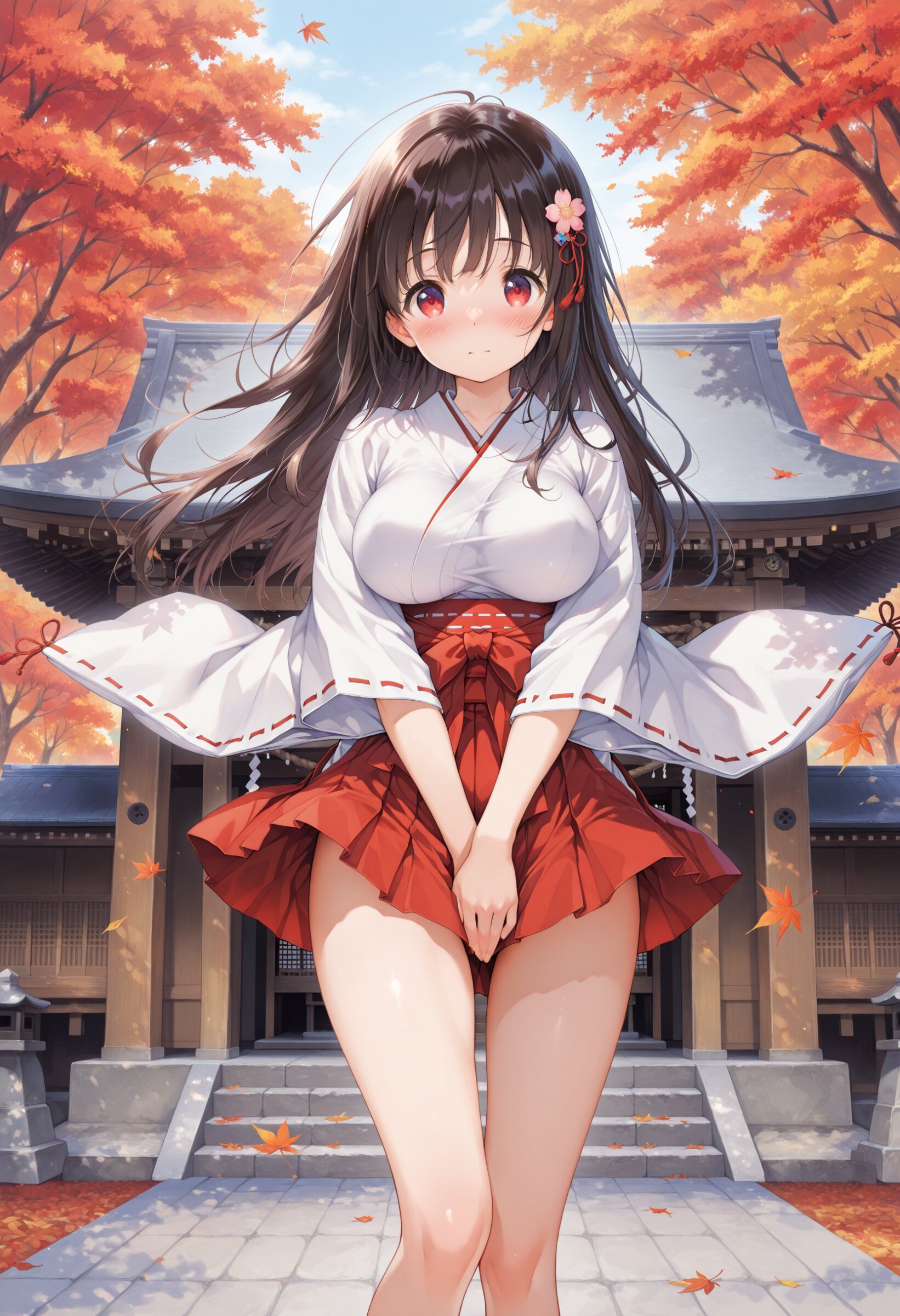 masterpiece, best quality, amazing quality, general, fine detail, official art, 1girl, loli, petite, beautiful hair, beautiful eyes, miko, miniskirt, beautiful legs, big breasts, impossible clothes, (perky breasts:1.2), innocent expression, in japanese shrine, autumn, strong wind, flipping skirt, covering crotch, blush, embarrassing,
