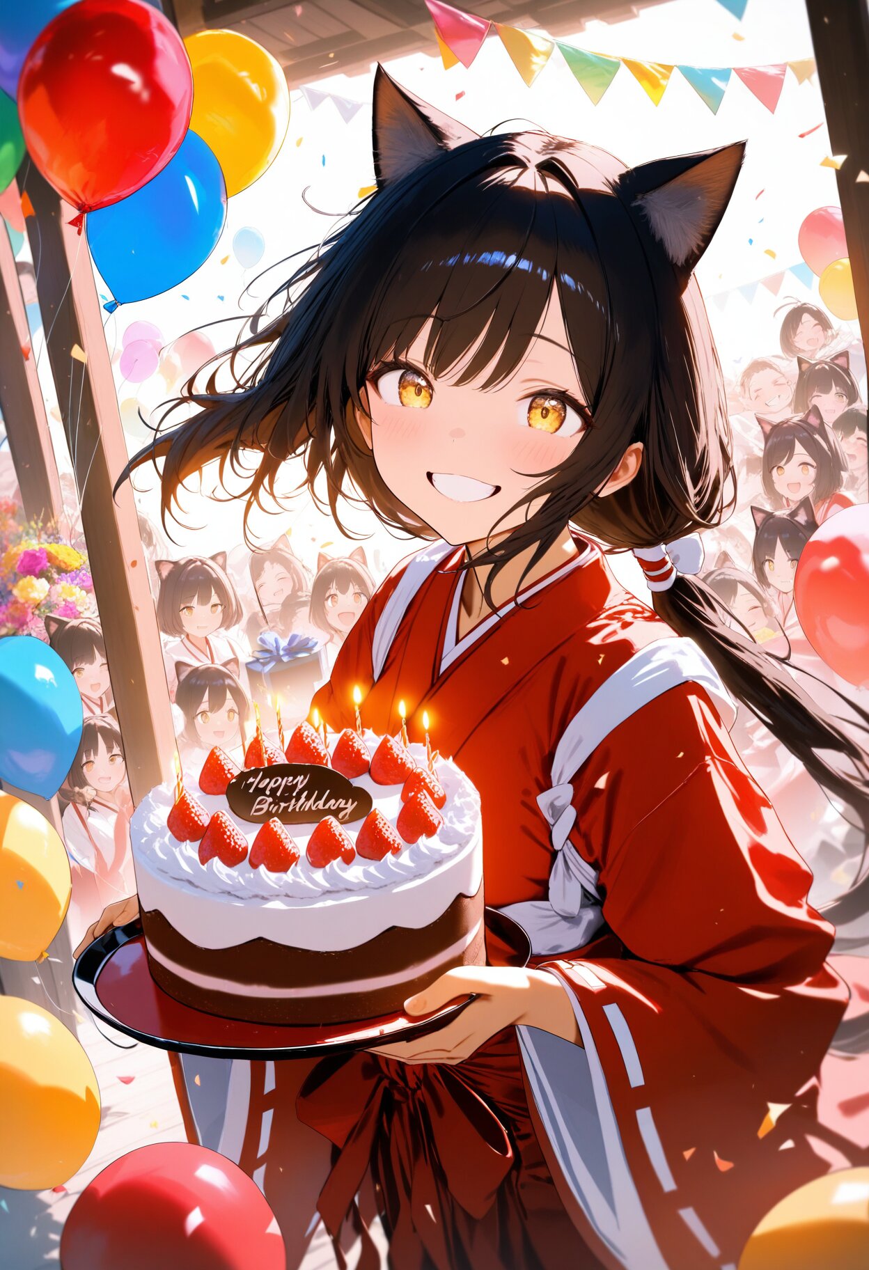 smile, gold amber eyes, low ponytail, black hair, cat ears, red samurai, grin, happy, open eyes, happy birthday, birthday party, birthday cake, present box, balloon, flower bouquet