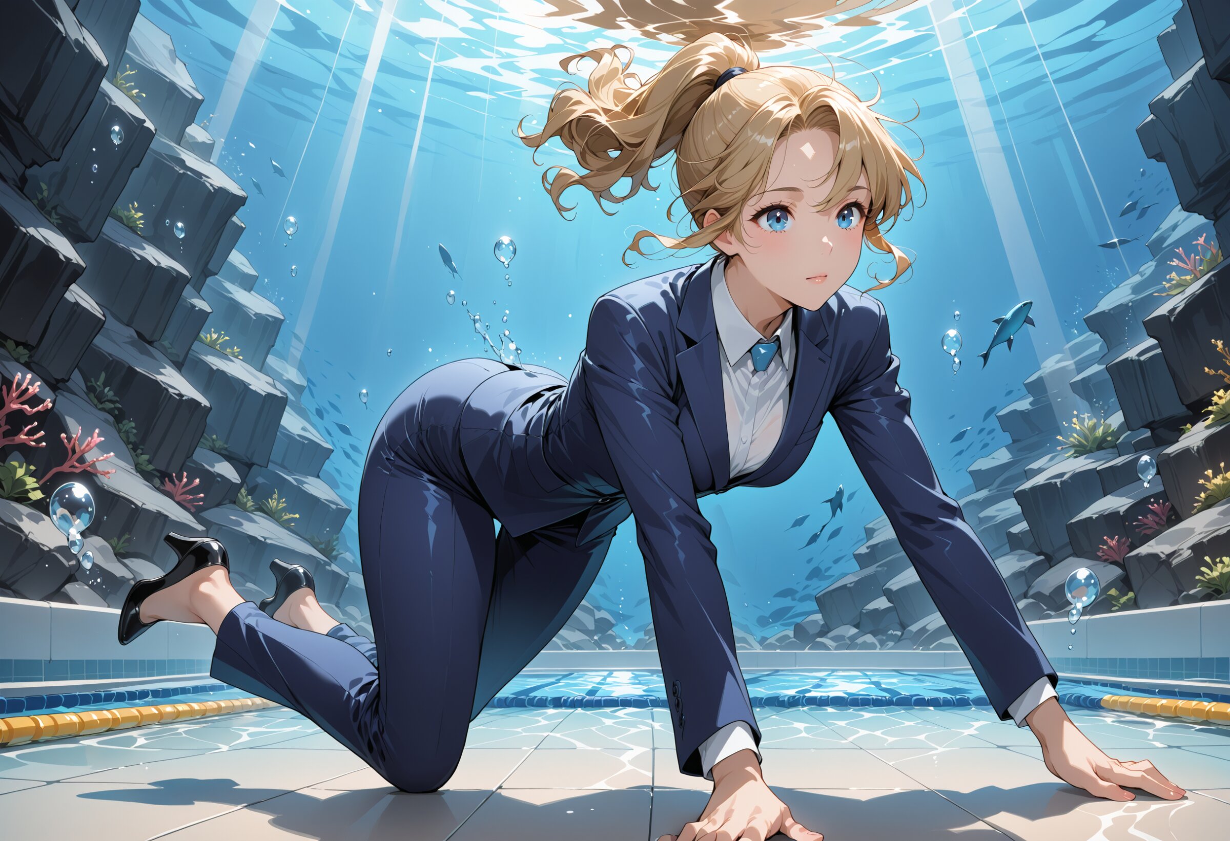 High resolution, Super detailed, Best Quality, masterpiece, 8K, 4K, beautiful background, the best aesthetics, BREAK 1woman, 21yo,short hair, ponytail, gold wavy hair, blue eyes,business suit,full body, pantsuit style, blue blazer, blue pants,black pumps,full clothes,swimming underwater, BREAK deep pool,clear blue water, bubbles, underwater light rays, caustics on the pool floor, shimmering surface, refraction, soft shadows, dynamic composition, floating particles, natural lighting ,