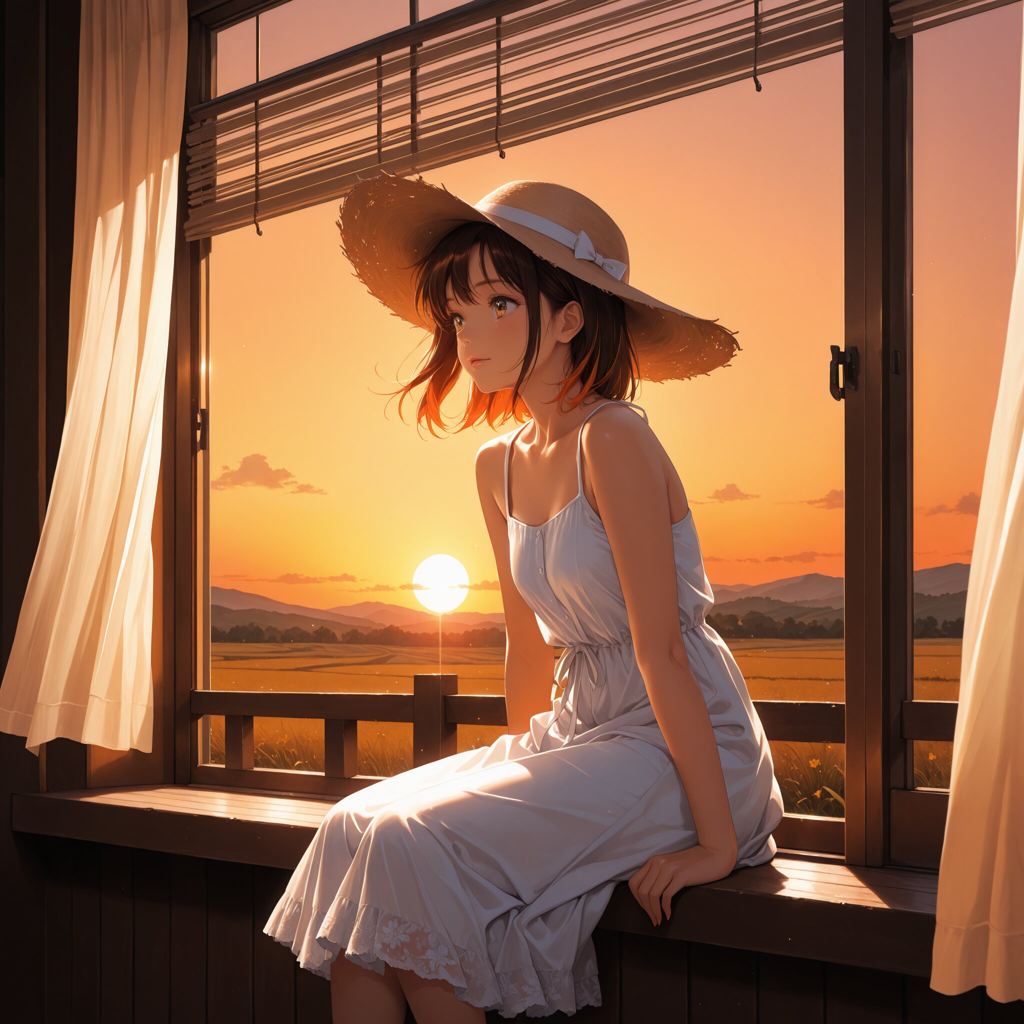 masterpiece, best quality, photorealistic, sharp focus, cinematic lighting, depth of field, beautiful composition, vibrant colors, ultra high res, 8K, highly detailed, masterpiece, best quality, very detailed, (masterpiece:1.2), (best quality), (ultra-detailed), 1girl, solo, beautiful young woman, wearing a wide-brimmed straw hat, white sundress, sitting on a wooden window sill, looking outside, nostalgic summer atmosphere, golden hour, deep orange sunset, fluttering lace curtains, soft evening breeze, rural landscape outside the window, 90s anime aesthetic style, soft grain, warm color palette, emotional and serene mood, sharp focus.
