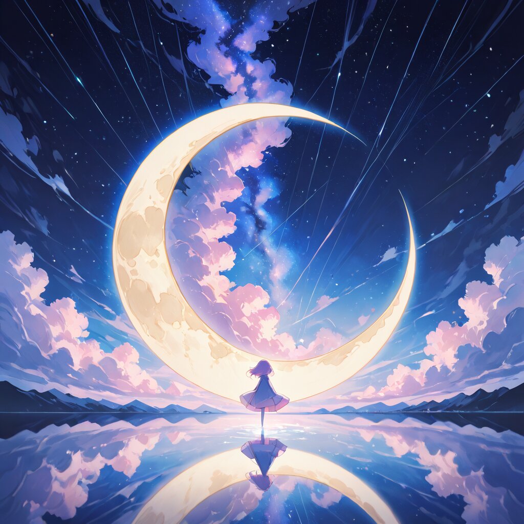 masterpiece, best quality, ultra detailed dreamy night sky background, soft pastel purple pink blue gradient, enormous glowing crescent moon with subtle inner glow, layered fluffy clouds with soft volumetric lighting, distant milky way and faint nebula depth, twinkling stars with varying brightness and sizes, ethereal god rays from moon, reflection on calm water mirror, distant misty mountains silhouette, anime style, makoto shinkai cinematic atmosphere but extremely soft and painterly, depth of field, bokeh foreground lights, magical serene romantic, high dynamic range, no humans