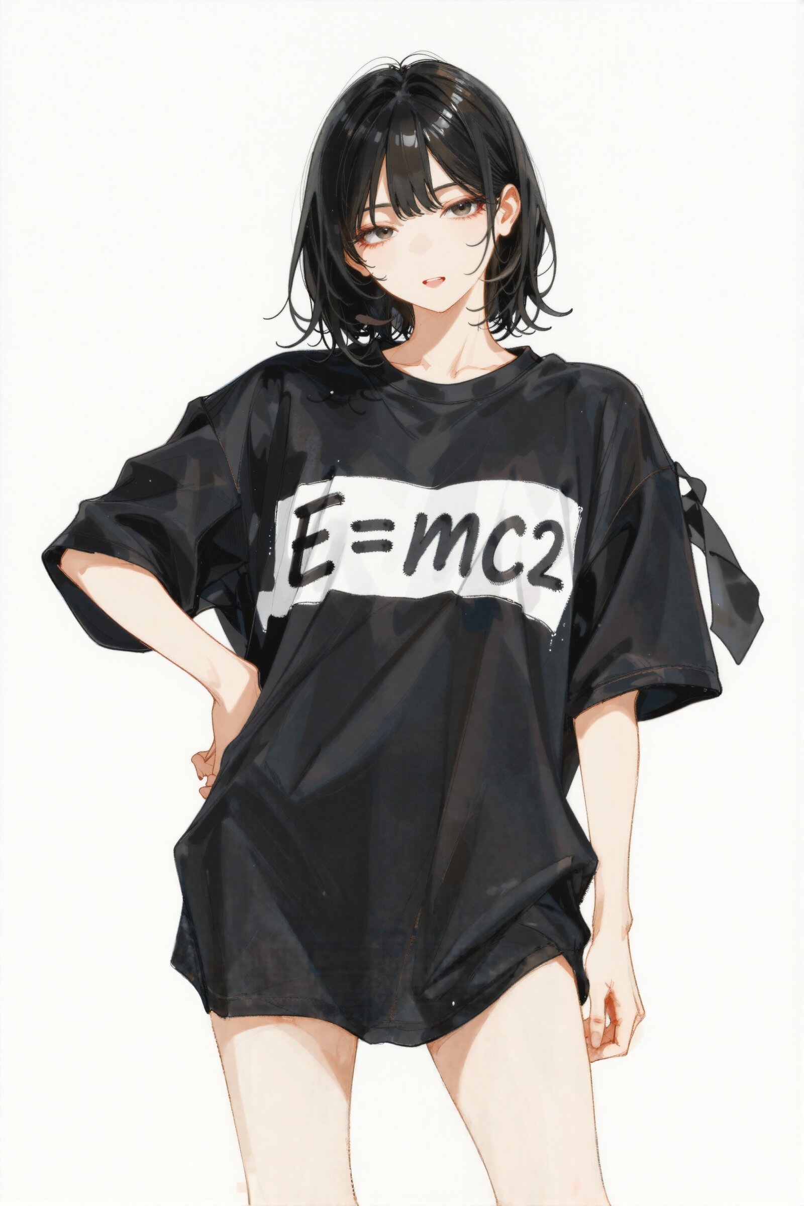 Scene: A woman posing playfully while wearing an oversized shirt. Character: A young adult woman with a relaxed and natural appearance. She is wearing a large, loose-fitting T-shirt (black base with wide diagonal white band with the number "E=mc2" written by graffiti font) that drapes softly over her body . Her hair is simple and slightly tousled, giving a casual impression. Action: She strikes a light, confident pose—one hand on her hip or lightly lifting the hem of the oversized shirt. Her expression is bright and friendly, with a soft smile. Environment: A simple white background with no additional elements. Clean, minimal, studio-like atmosphere. Style: soft, clean, Flat draw, Anime style illustration with gentle shading and smooth lines. Focus on the silhouette created by the oversized shirt. Mood: Casual, playful, relaxed, and slightly charming. Technical: Centered composition with clear visibility of the oversized shirt’s shape. Soft lighting, minimal shadows, and no background distractions. Emphasis on pose, expression, and the drape of the shirt.