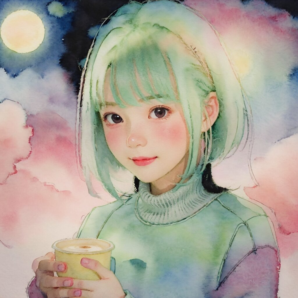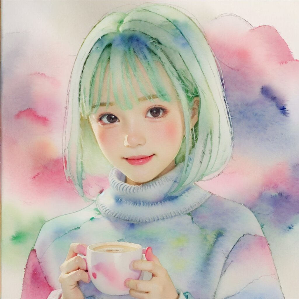 best quality, masterpiece, (watercolor painting:1.34), (line art:1.3), (illustration:1.3), (cel anime:1.2) dramatic lighting,, light on face:1.0, Golden Hour, Portrait, face closeup, 1 cute girl, (kawaii:1.1), (loli:1.6), (small breasts:1.4), (small head:1.5), brown eyes, round face:1.2, eyes detail, (smile:0.9), (black bob cut), (smile:0.8), (hands on caffee:1.0), sweater, (knit:1.2), turtleneck, (looking at viewer:1.2),